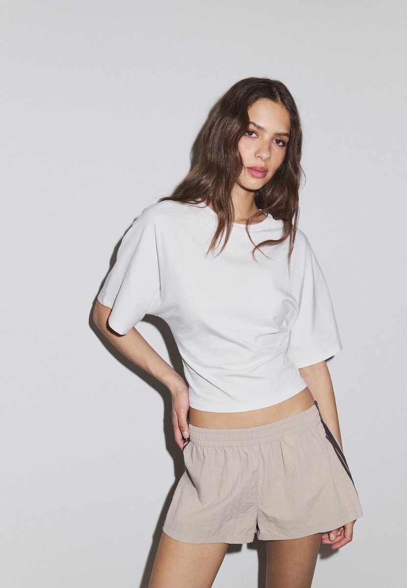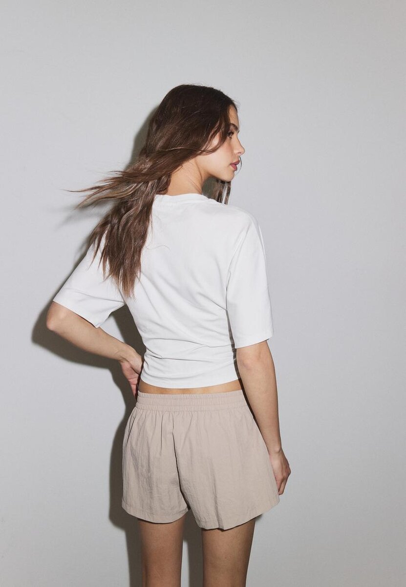 Mini-short fluide en tissu technique. Taille haute et ceinture élastiquée avec bandes latérales contrastées.