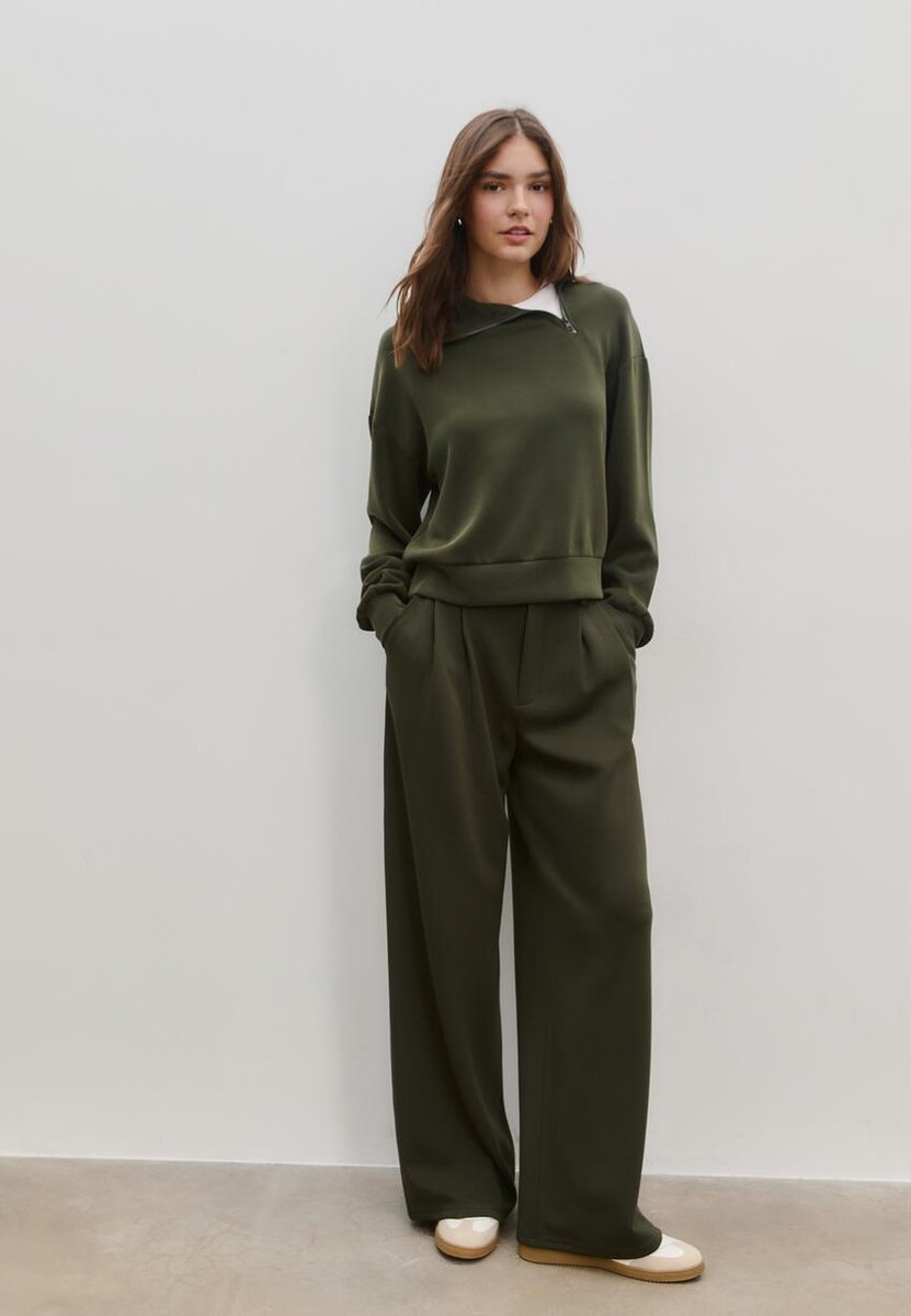 Sweat-shirt confectionné dans un mélange de modal pour un toucher très doux. Col montant avec fermeture éclair en diagonale et manches longues à revers. Disponible en plusieurs couleurs.