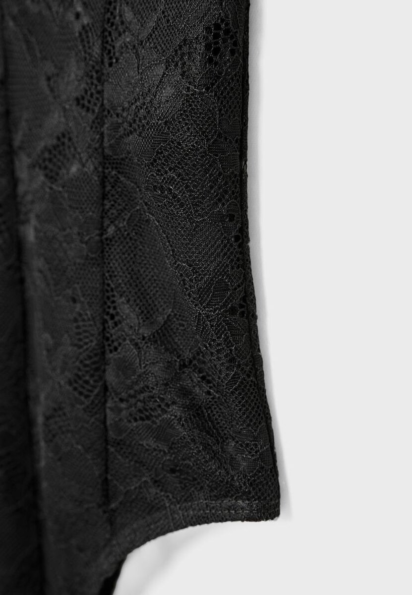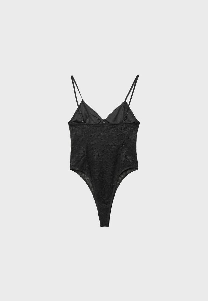 Body en dentelle extensible. Encolure en cœur avec fines bretelles et bonnets. Doublure assortie. Fermeture à boutons-pression au bas. Disponible dans une gamme de couleurs.