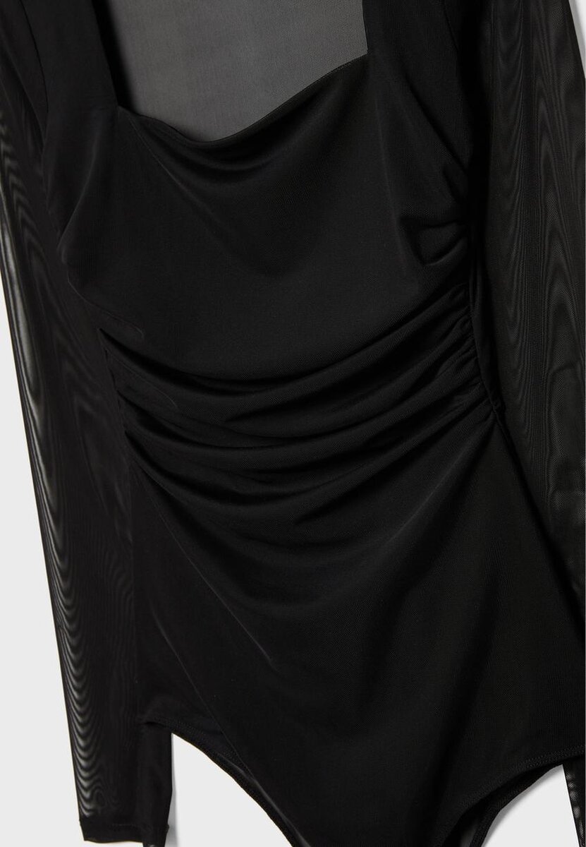 Body ajusté en tulle. Doté d’une encolure carrée et de manches longues avec une finition semi-transparente. Détail froncé sur le côté. Se ferme au bas à l’aide de boutons-pression. Disponible en plusieurs couleurs.