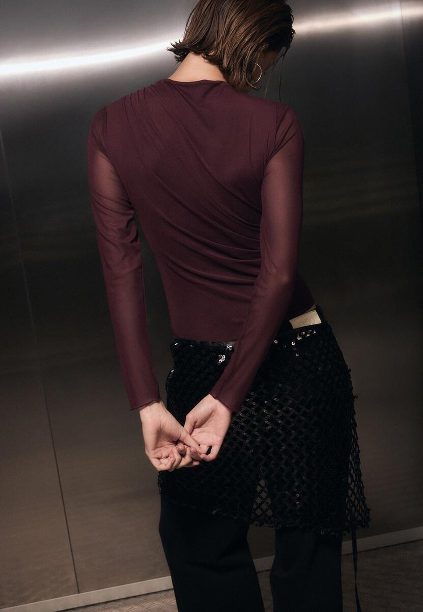 Body ajusté en tulle. Col montant et manches longues avec finition semi-transparente. Orné de fronces. Se ferme au bas à l’aide de boutons-pression. Disponible en plusieurs couleurs.