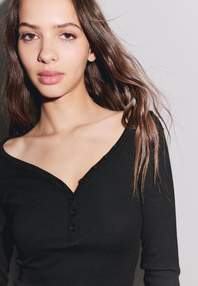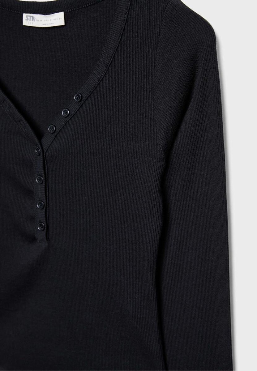 T-shirt ajusté à col en V boutonné et manches longues. Disponible en plusieurs couleurs.