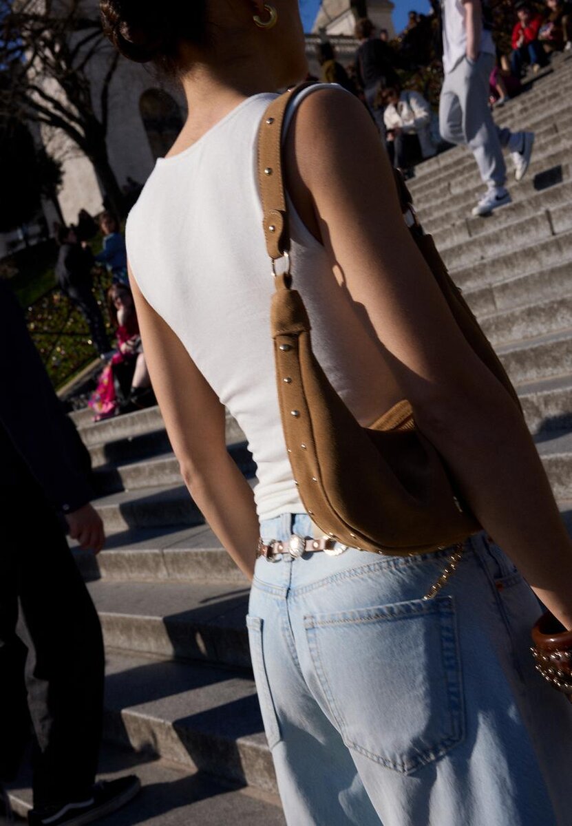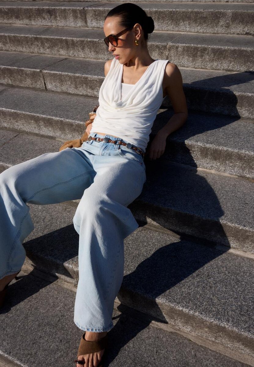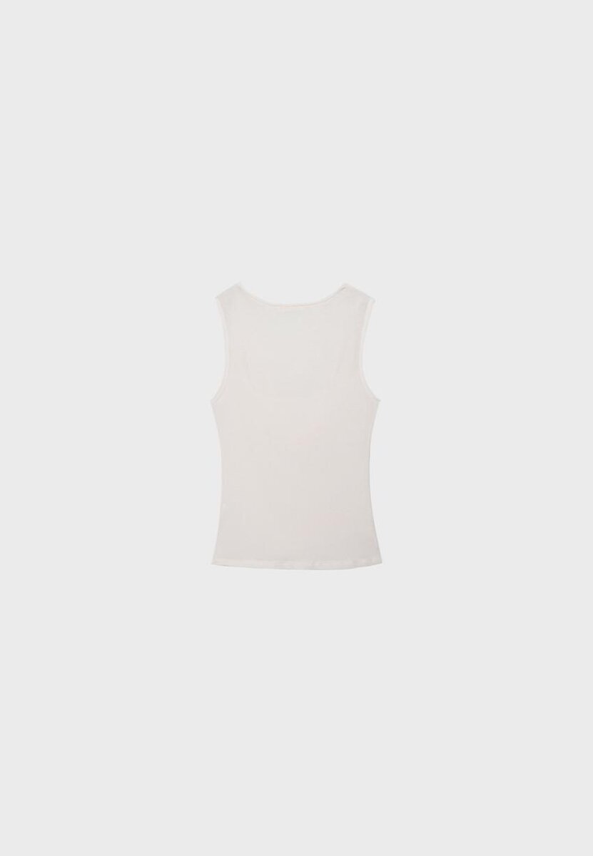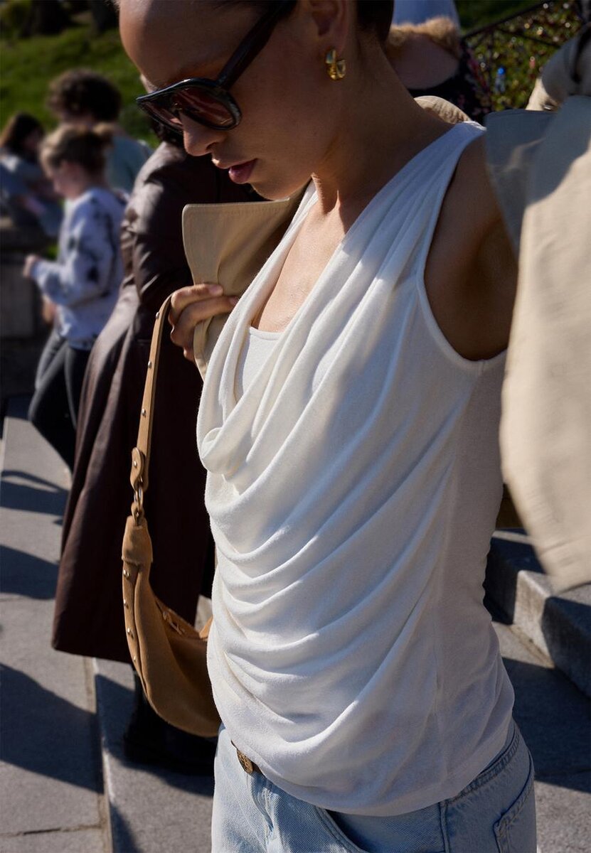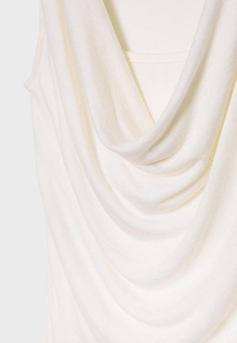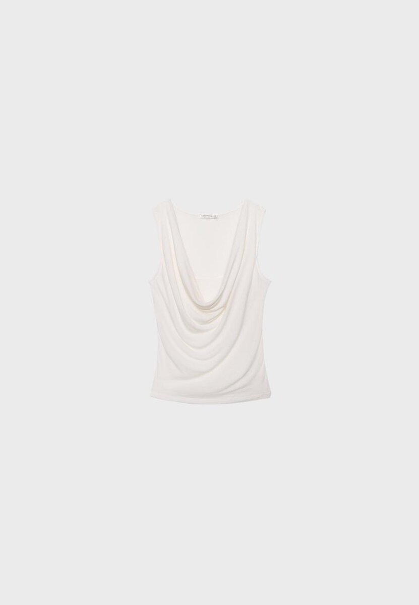 Haut sans manches avec encolure drapée. Détail double épaisseur au niveau de l’encolure. Ourlet droit.