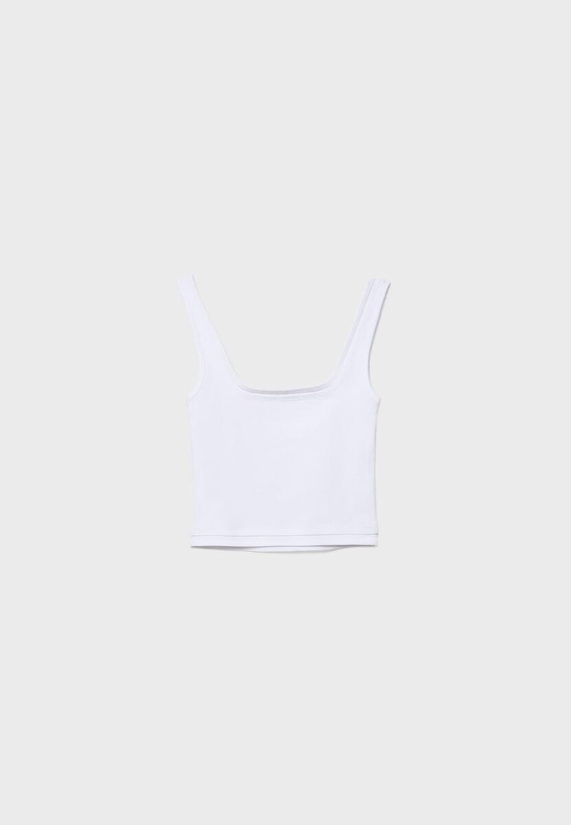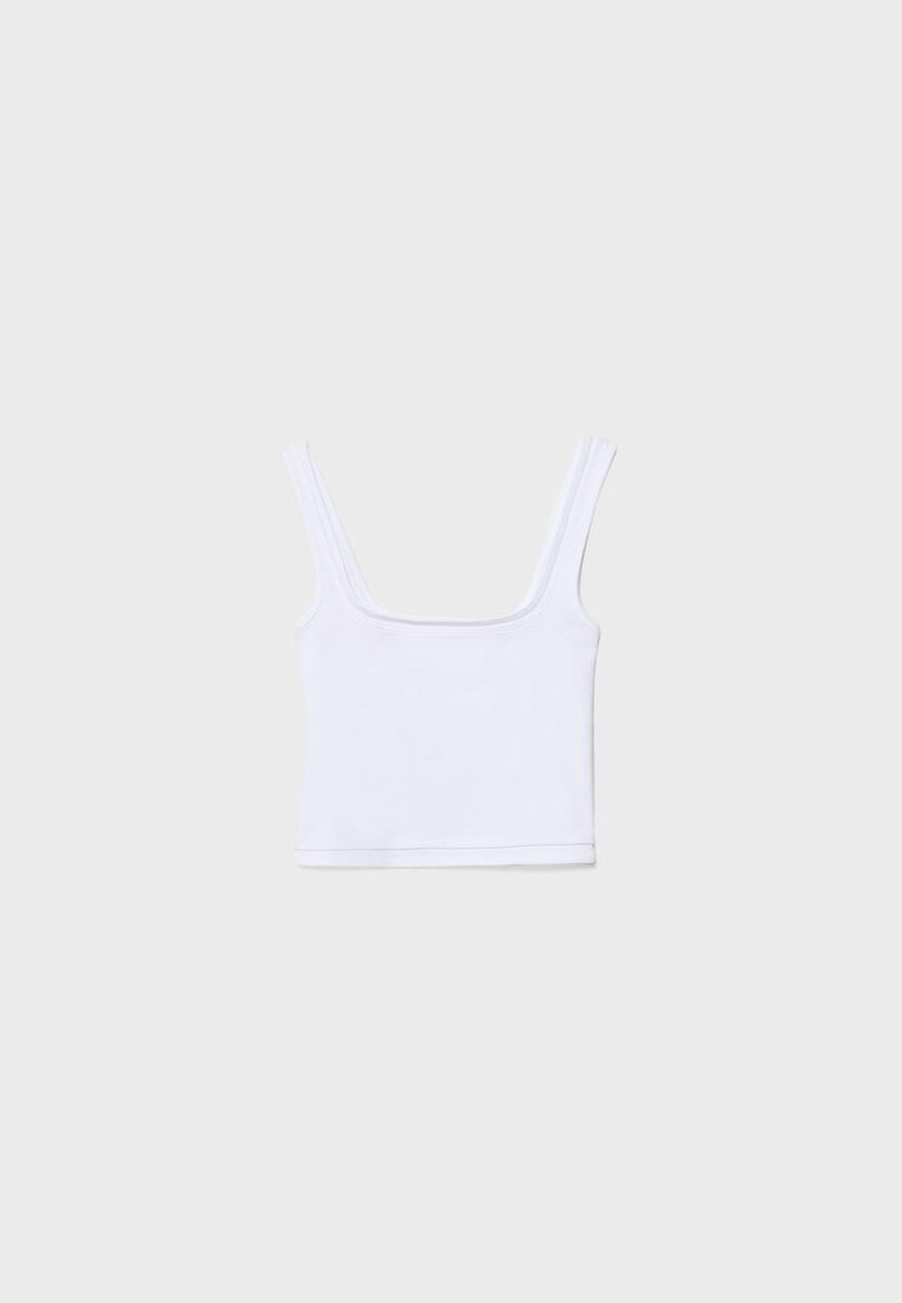 Haut à encolure carrée avec bretelles. Avec superposition de tissu contrasté effet deux pièces. Disponible en plusieurs couleurs.
