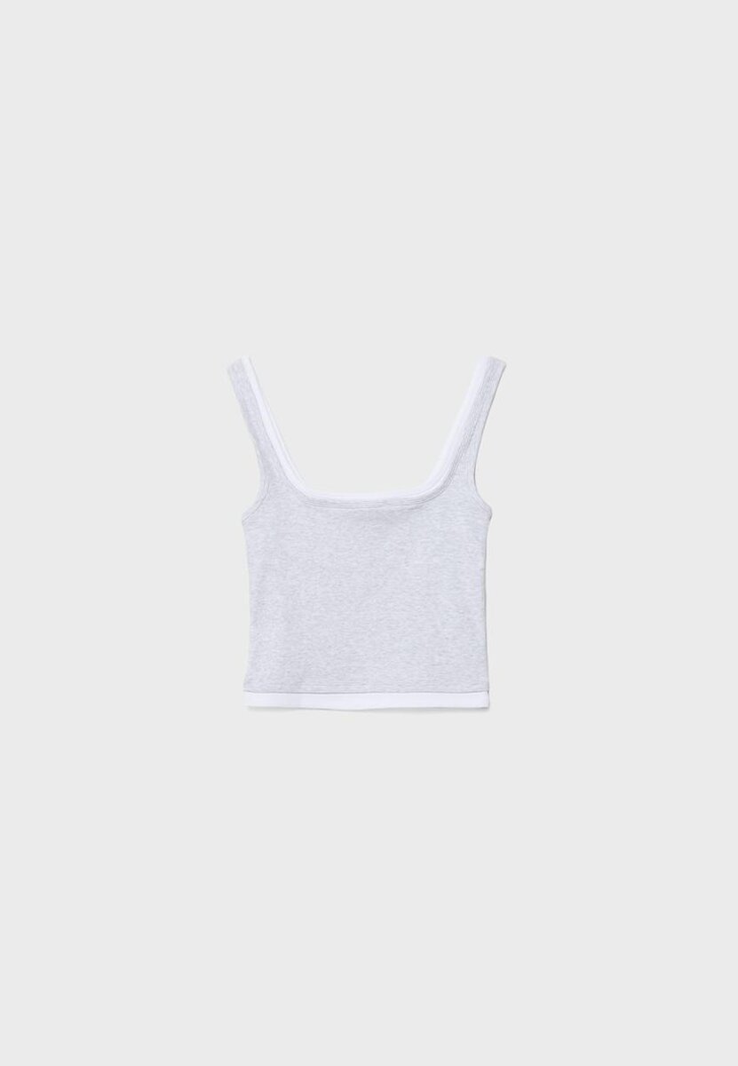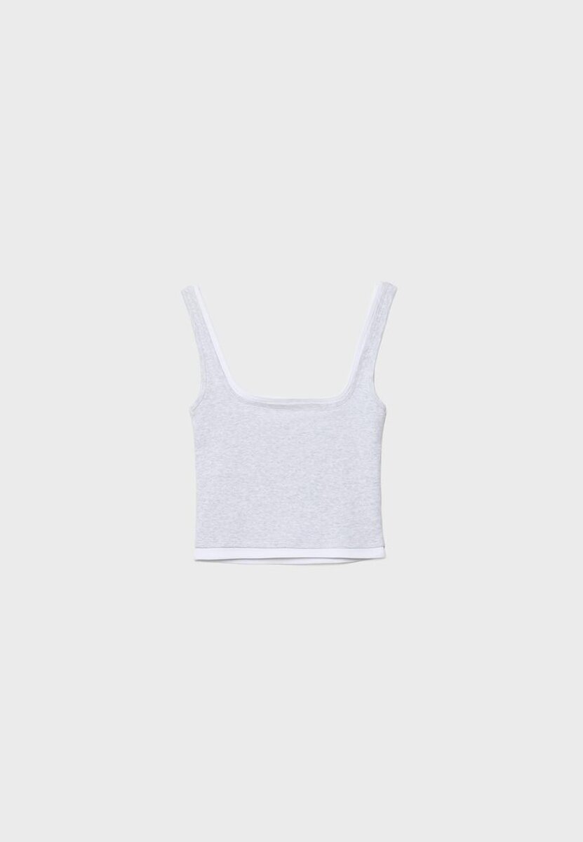 Haut à encolure carrée avec bretelles. Avec superposition de tissu contrastant effet deux pièces. Disponible en plusieurs couleurs.