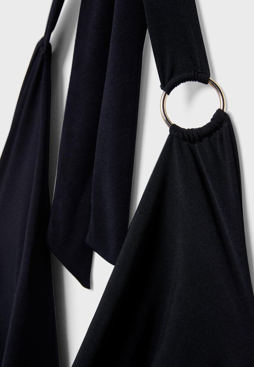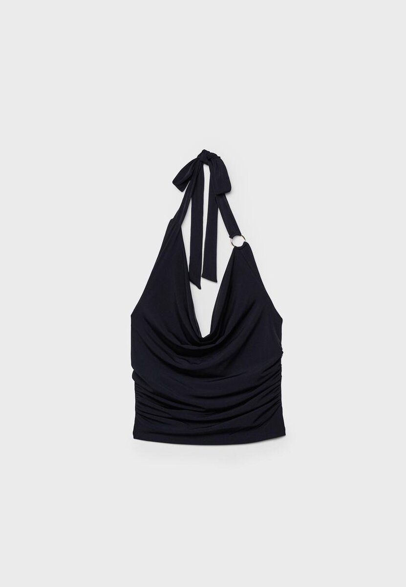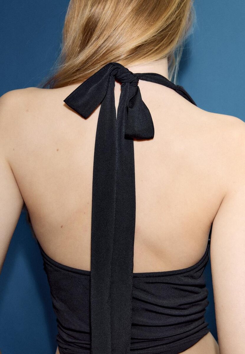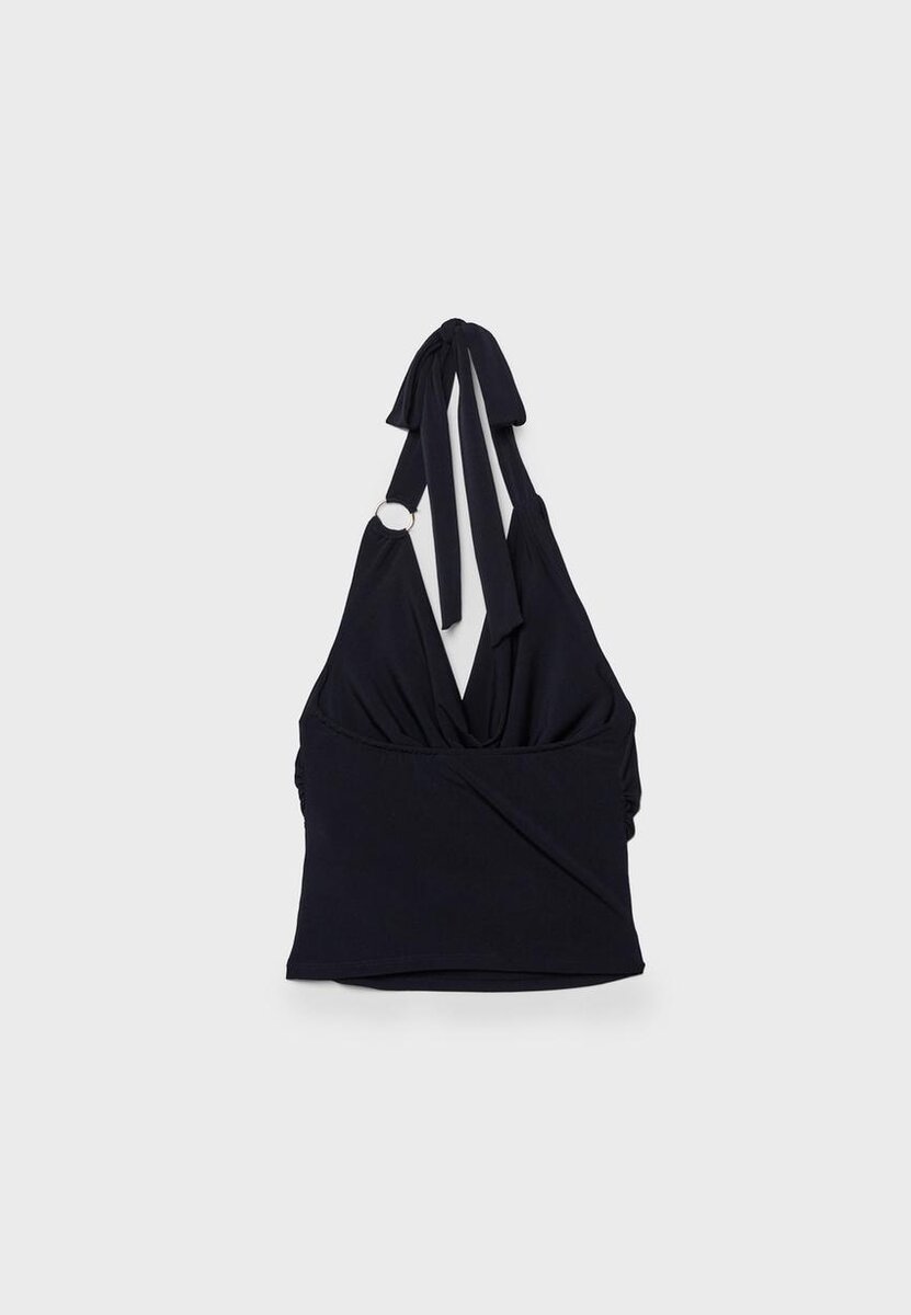 Hauts ajustés en tissu extensible. Encolure en V profonde réglable par un nœud dans la nuque. Tissu froncé sur les côtés. Détail anneau métallique.