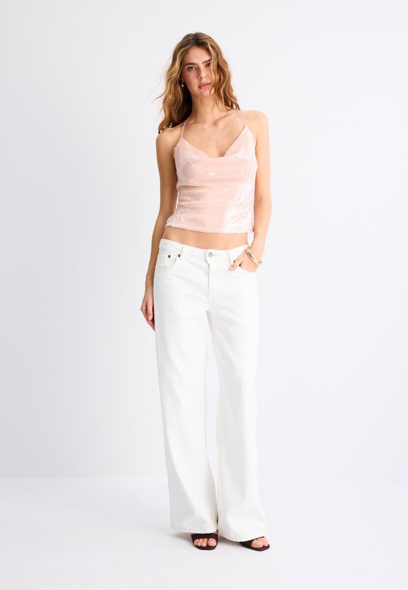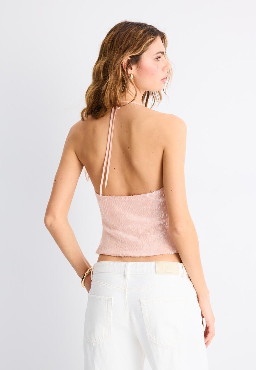 Hauts dos nu ajustables avec nouage au cou. Dos nu. En tissu à paillettes. Disponible en plusieurs couleurs.