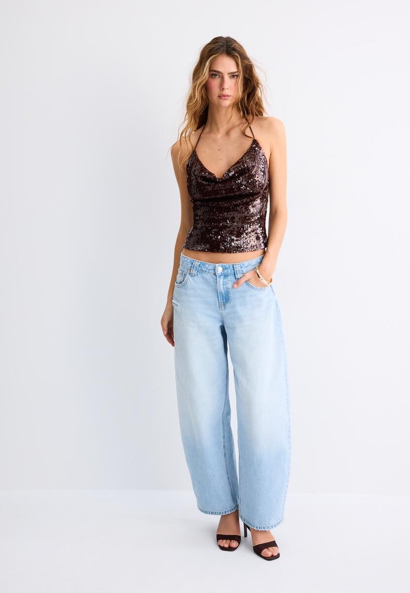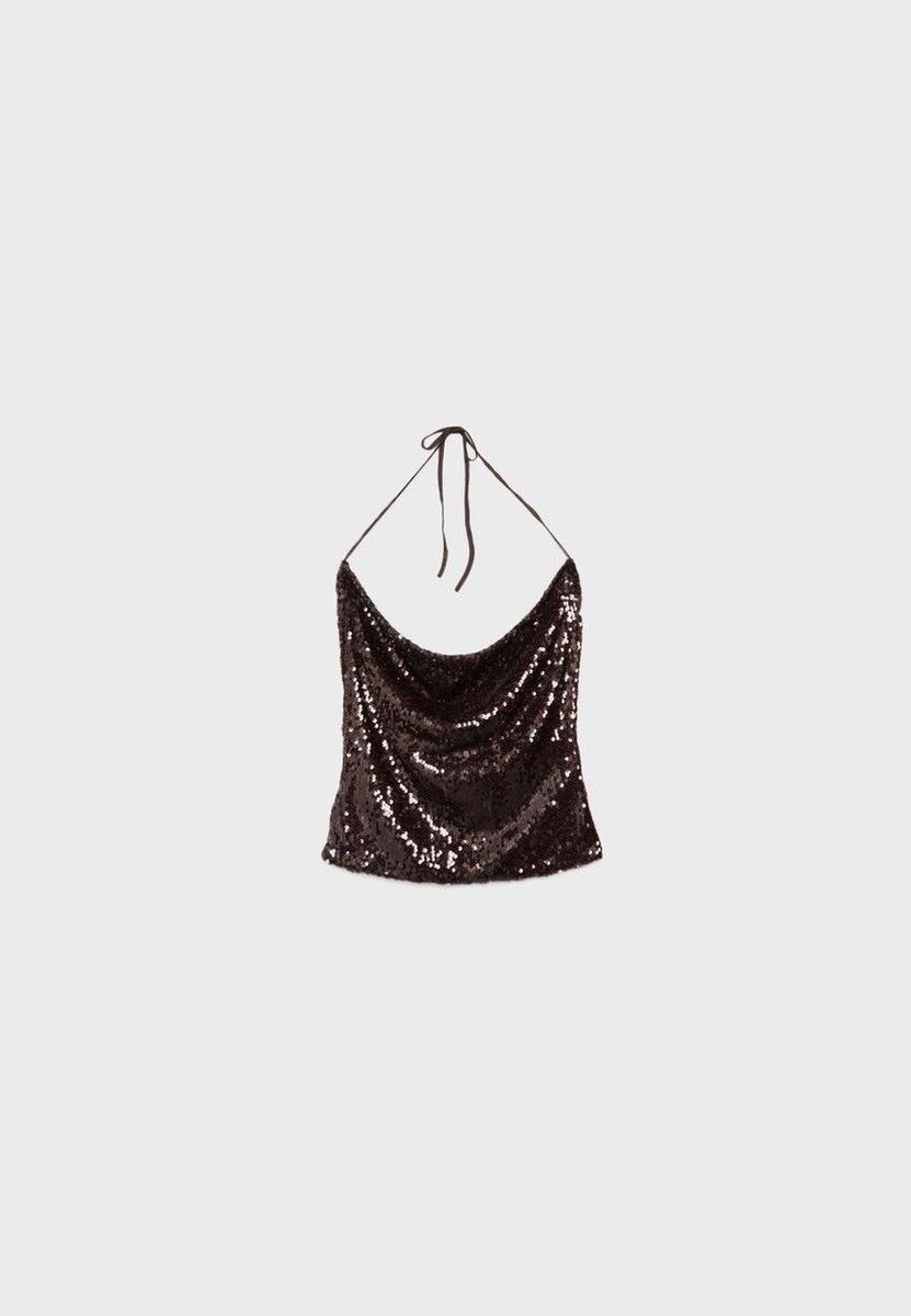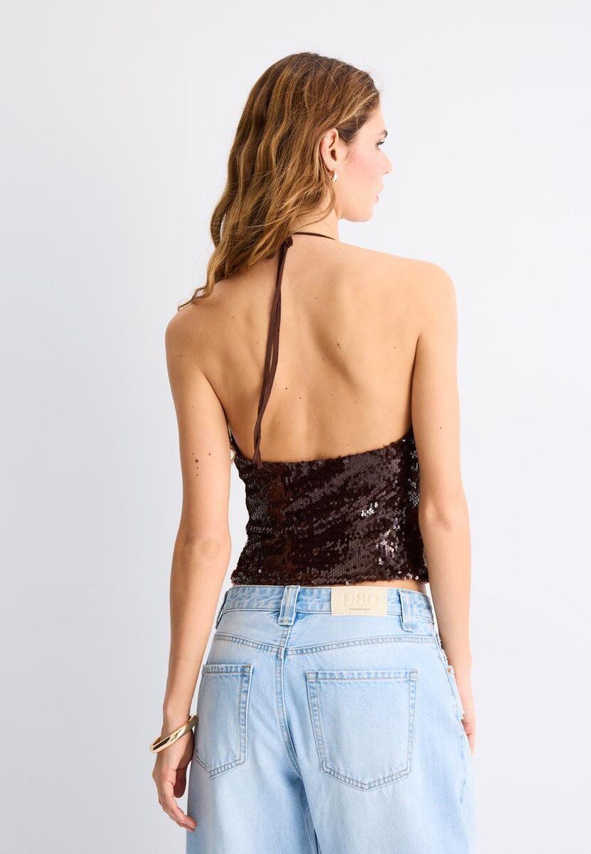 Hauts dos nu ajustables avec nouage dans le cou. Dos nu. En tissu à paillettes. Disponible en plusieurs couleurs.