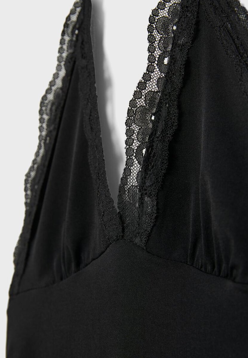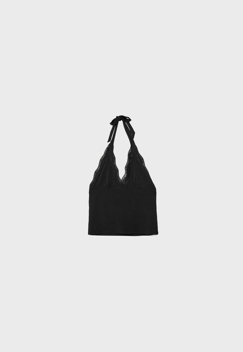 Hauts dos nu ajustables avec un nœud au niveau du col en V. Finitions en dentelle.