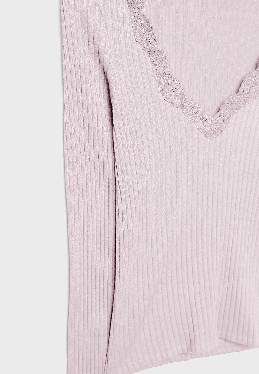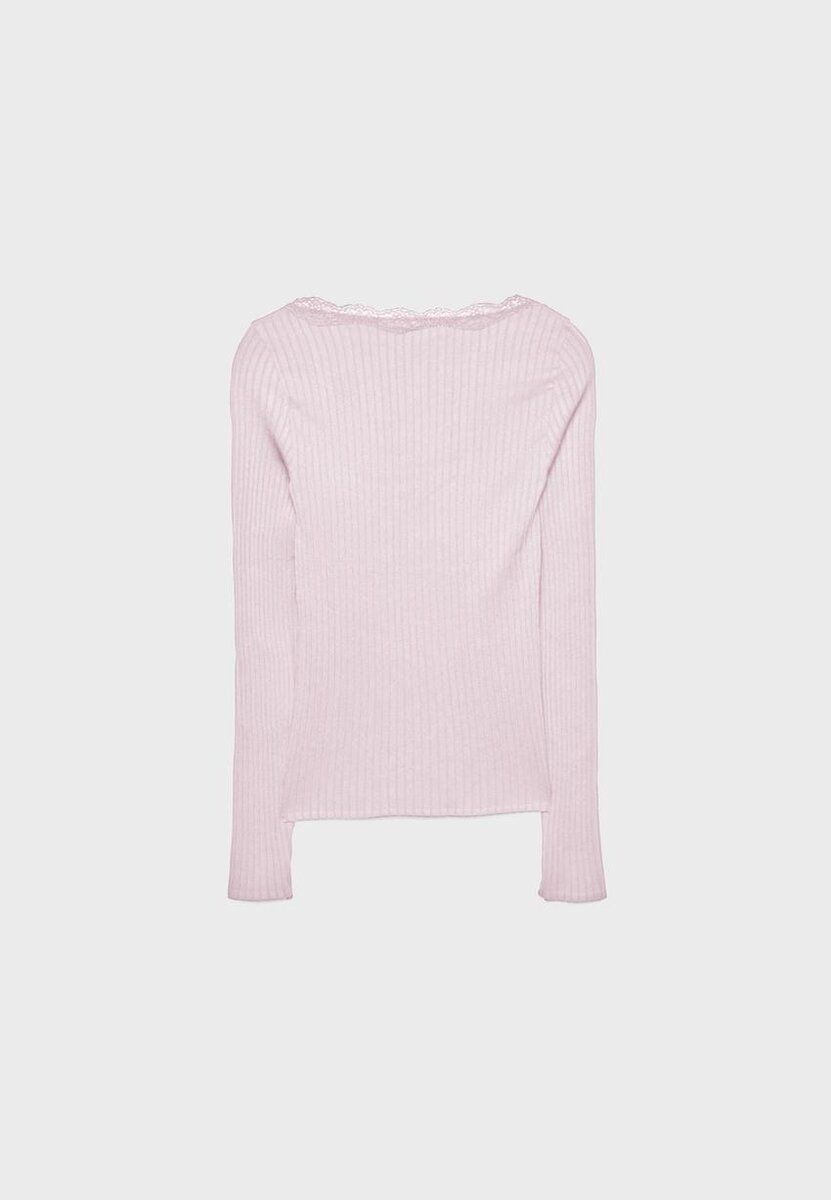T-shirt ajusté sans coutures à col en V, avec détails en dentelle assortis et manches longues. Disponible en plusieurs couleurs.