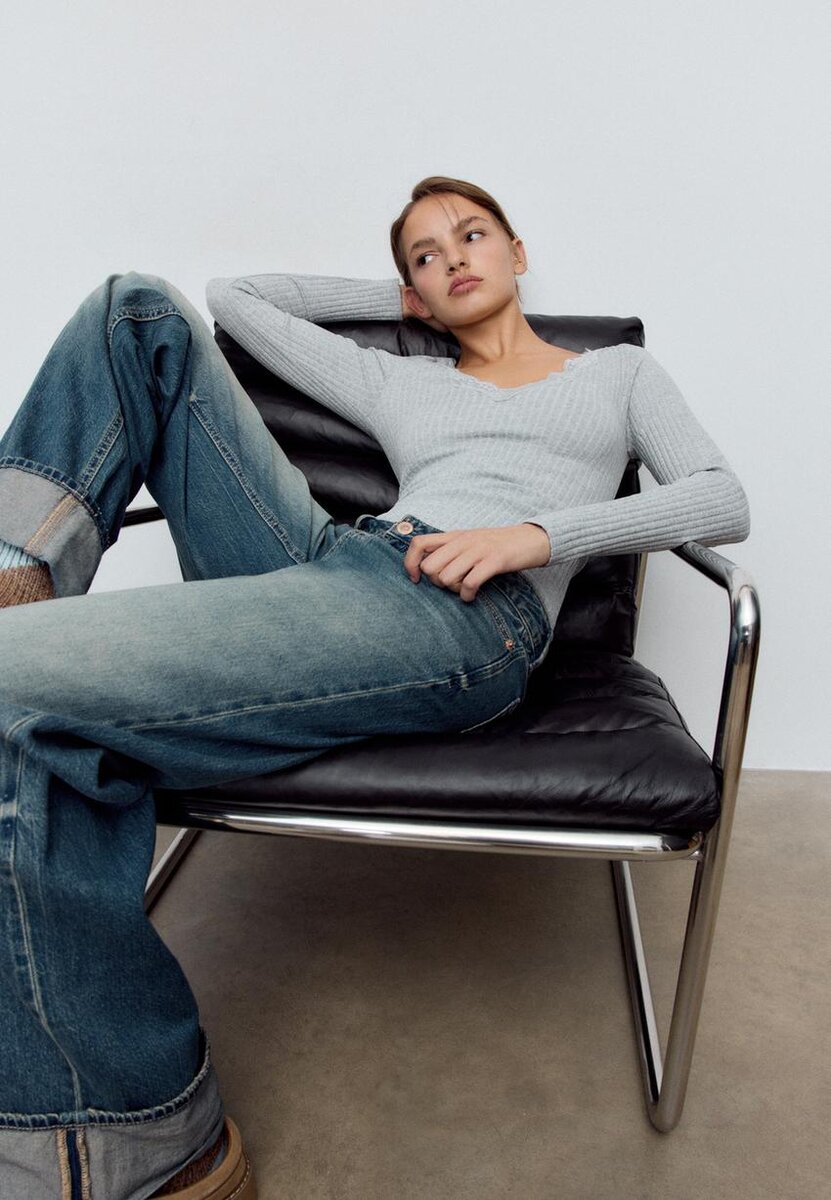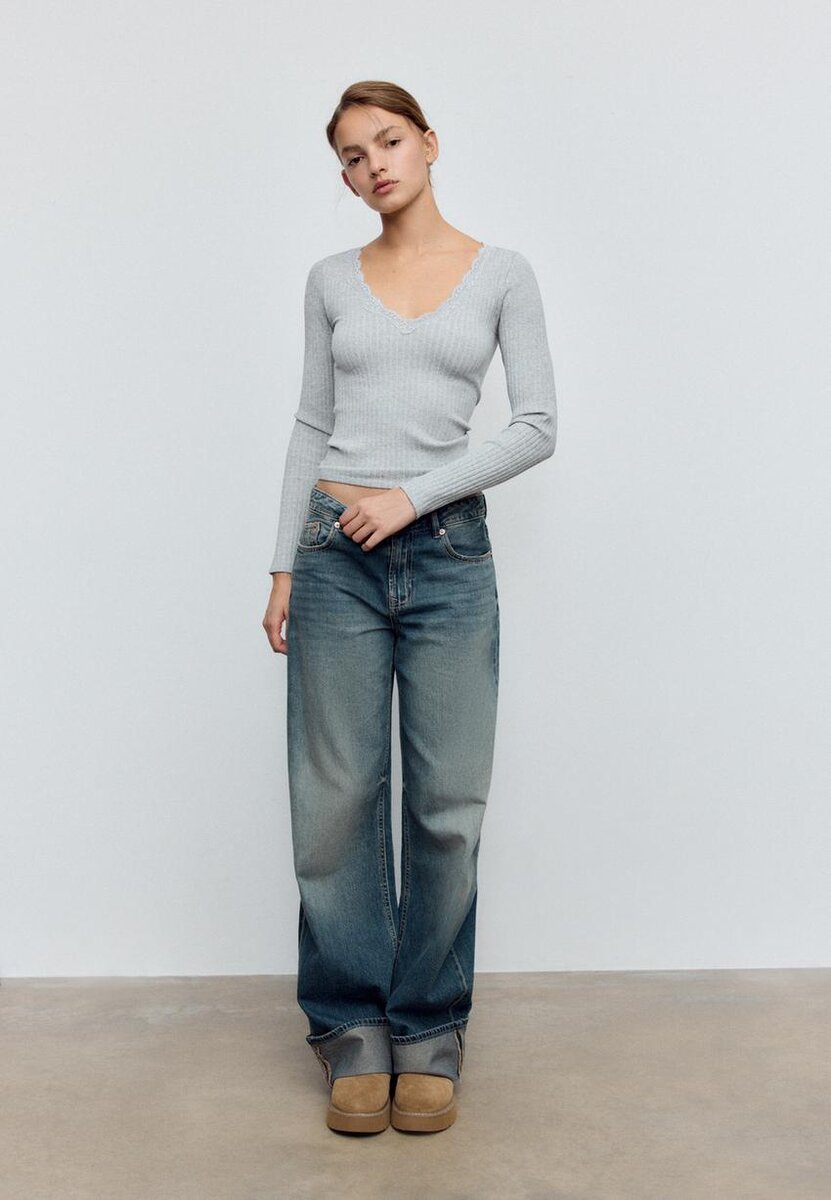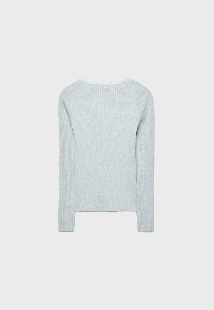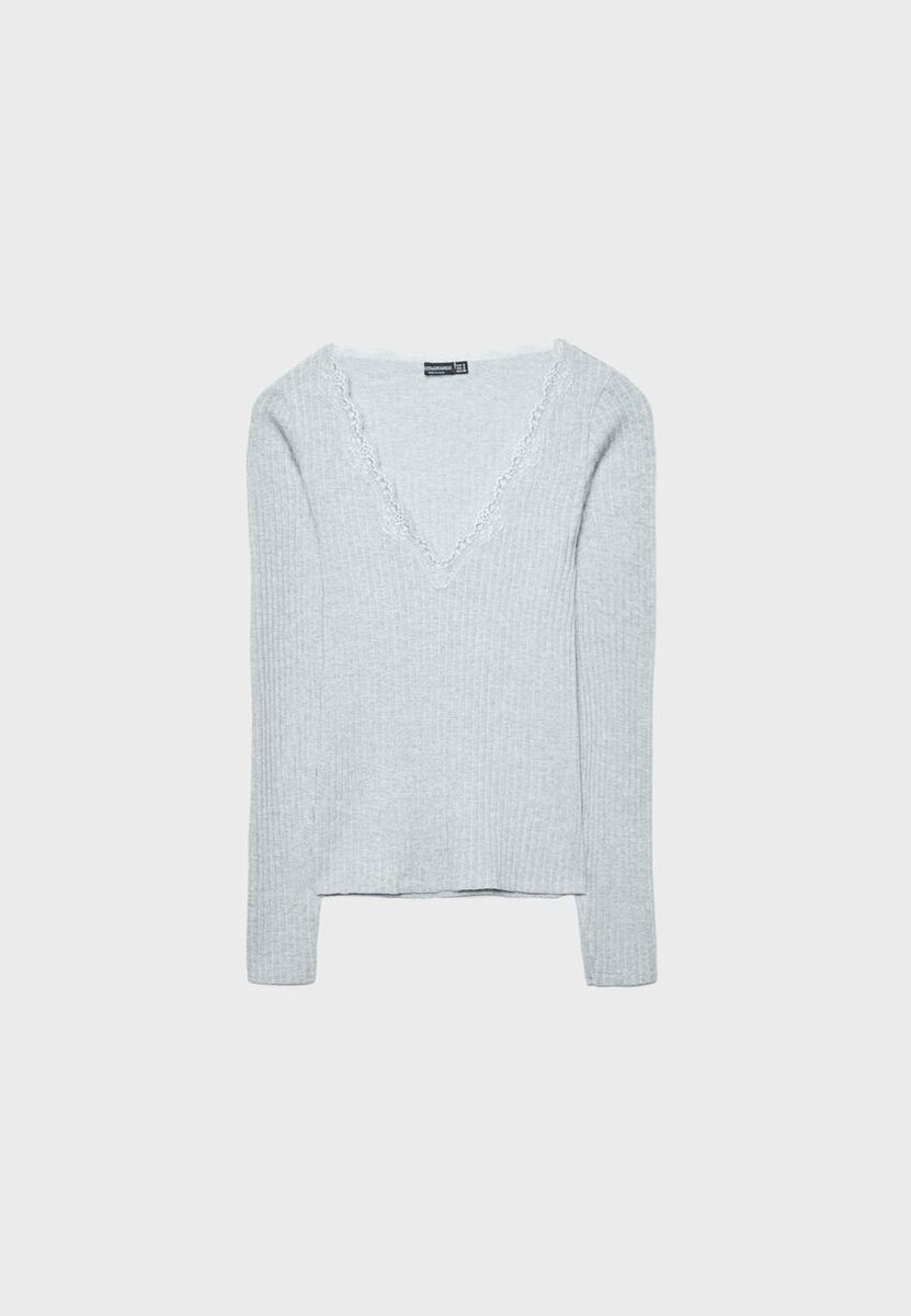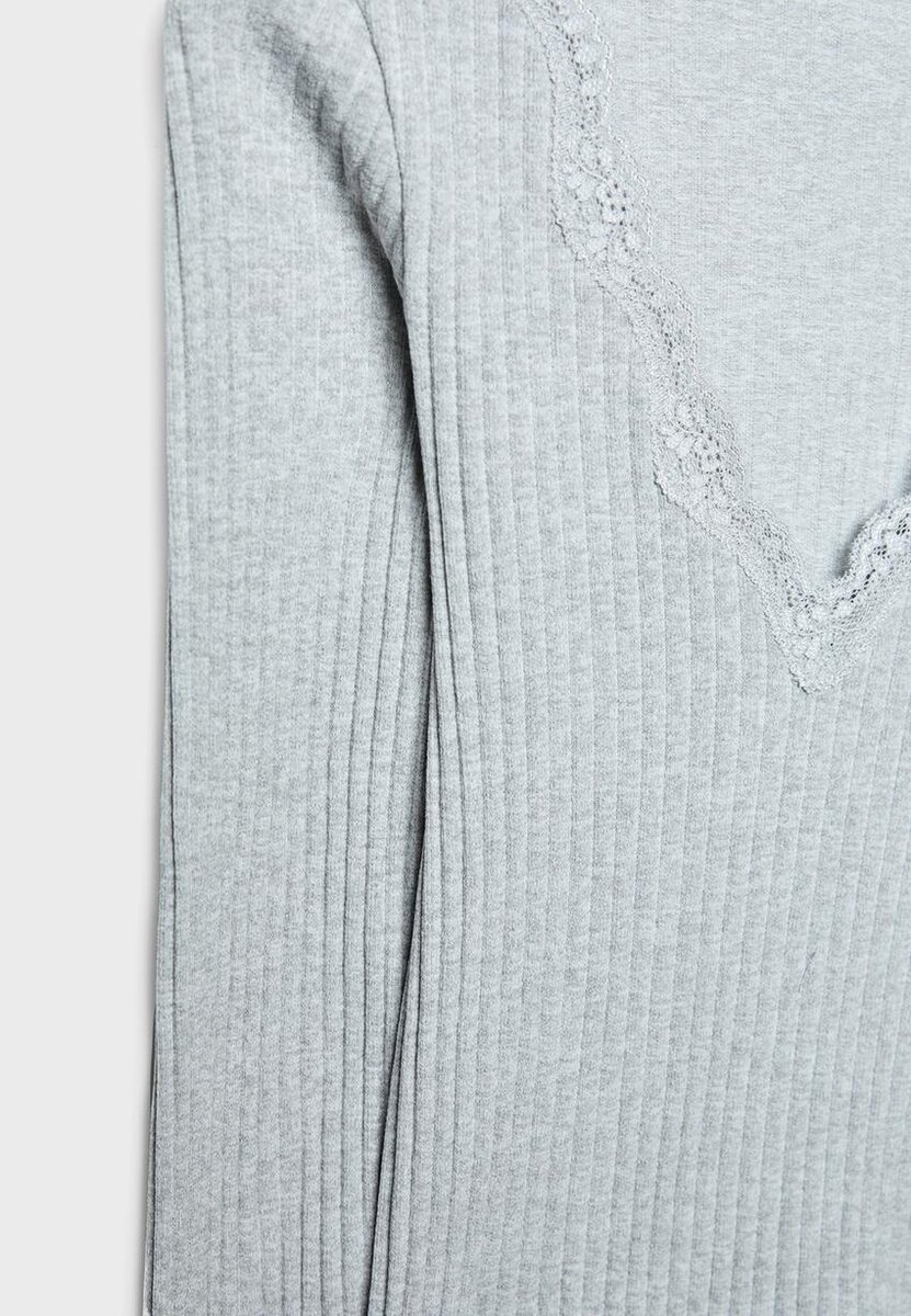T-shirt ajusté sans coutures à col en V, avec détails en dentelle assortis et manches longues. Disponible en plusieurs couleurs.