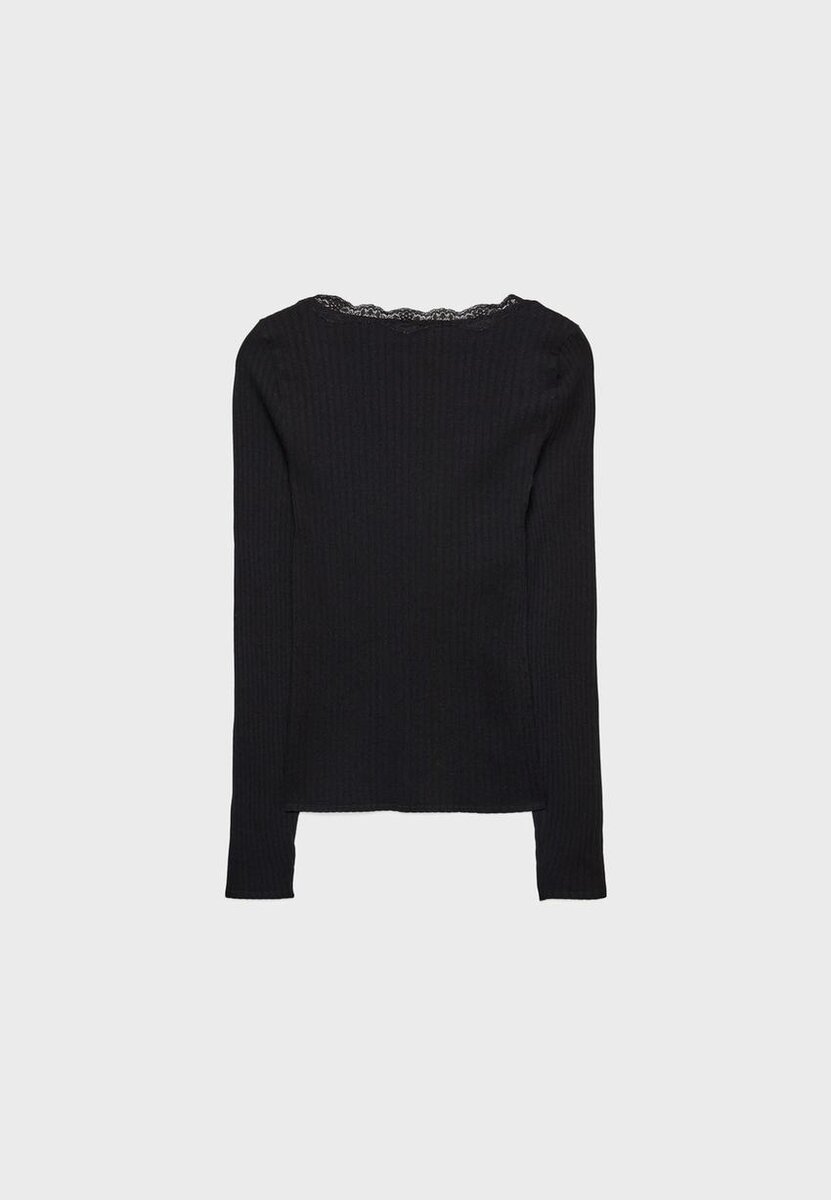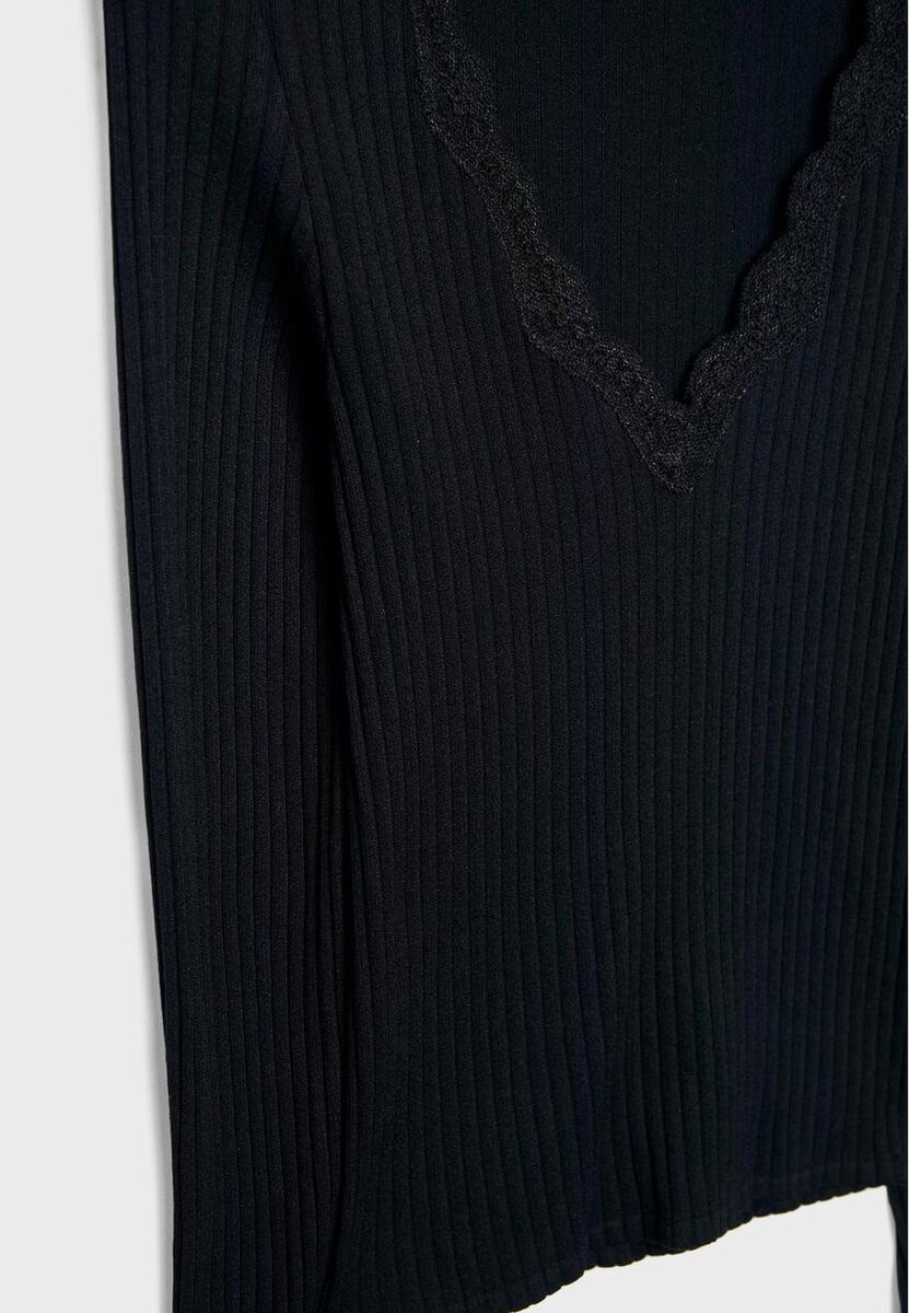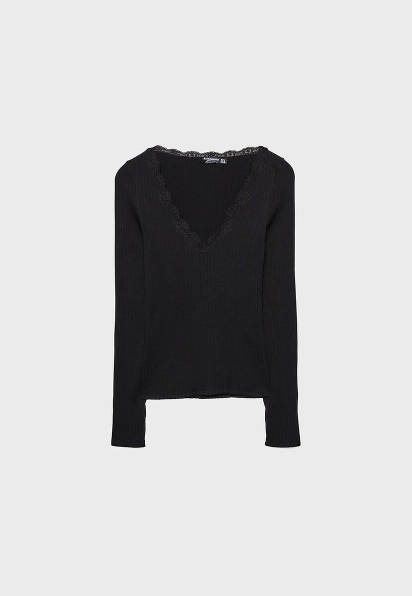T-shirt ajusté sans coutures à col en V, avec détail en dentelle assorti et manches longues. Disponible en plusieurs couleurs.