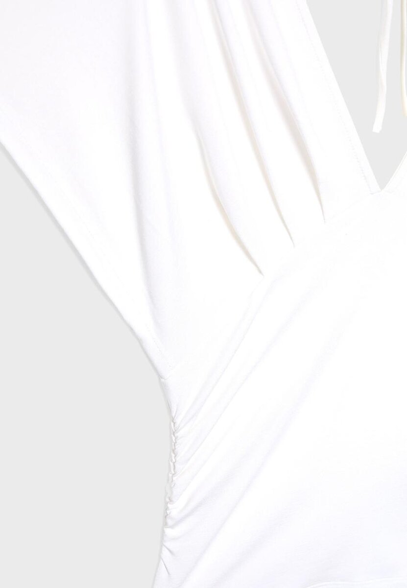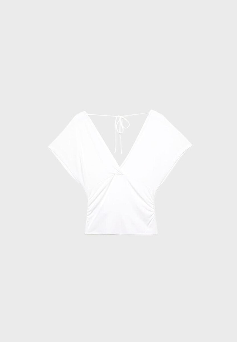 T-shirt à col en V et manches courtes. Fermeture à nouer dans le dos dans le même tissu. Ourlet ajusté. Disponible en plusieurs couleurs.