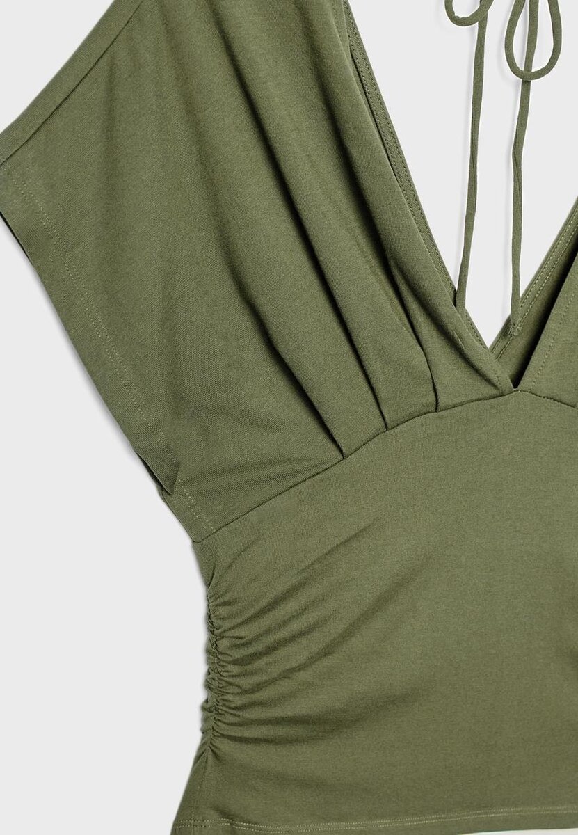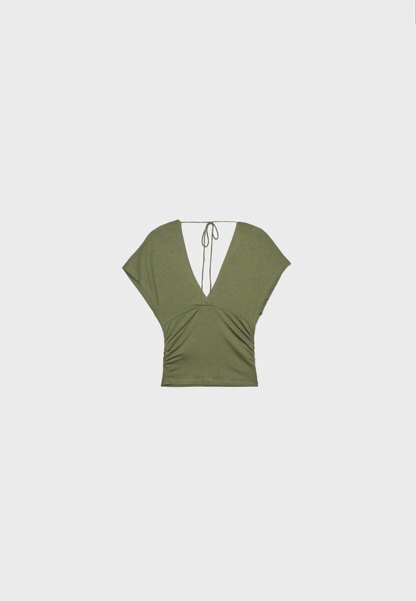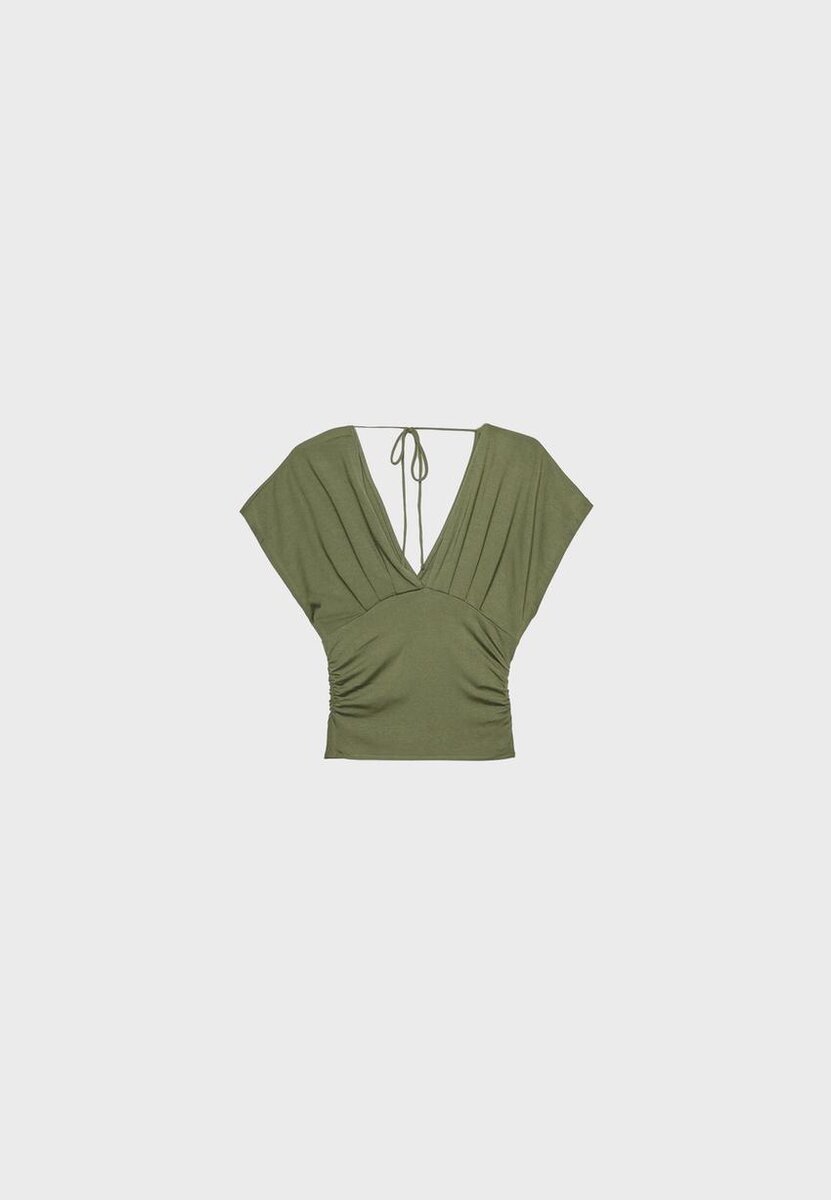 Haut à col en V et manches courtes. Fermeture à nouer dans le dos dans le même tissu. Ourlet ajusté. Disponible en plusieurs couleurs.
