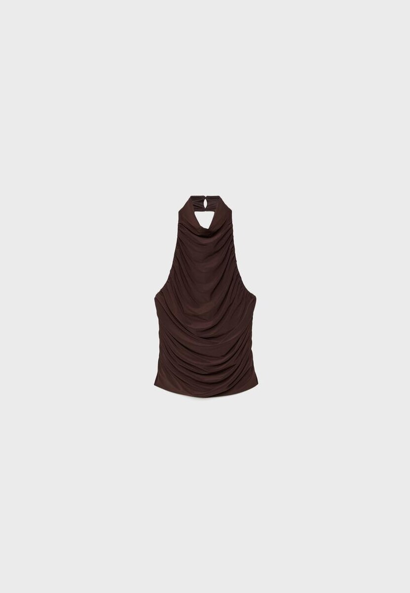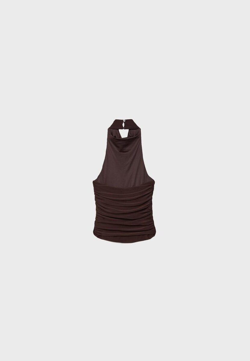 Haut dos nu avec fermeture à boutons dans le dos. Épaules et dos dénudés. Avec détails en tissu froncé.