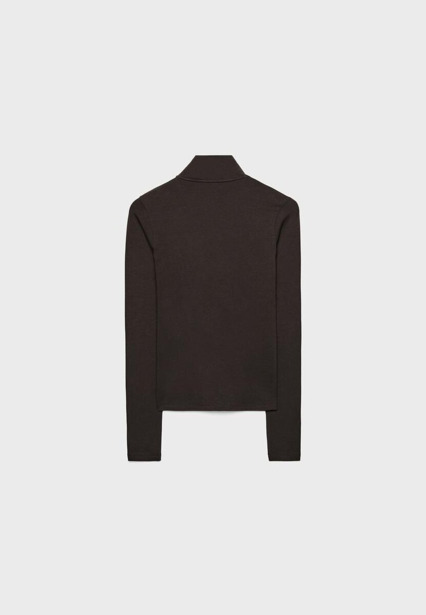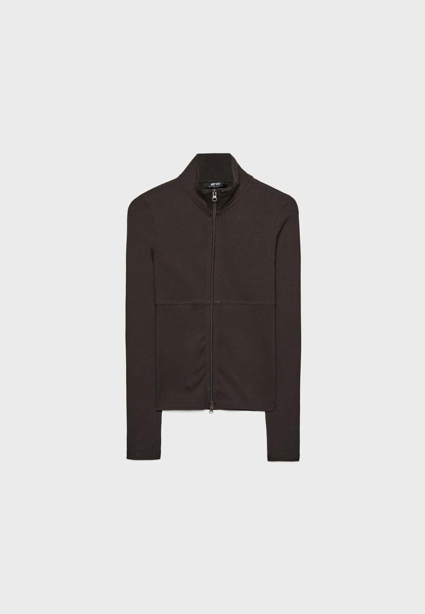 T-shirt à manches longues et col montant. Fermeture à glissière double sens sur le devant.