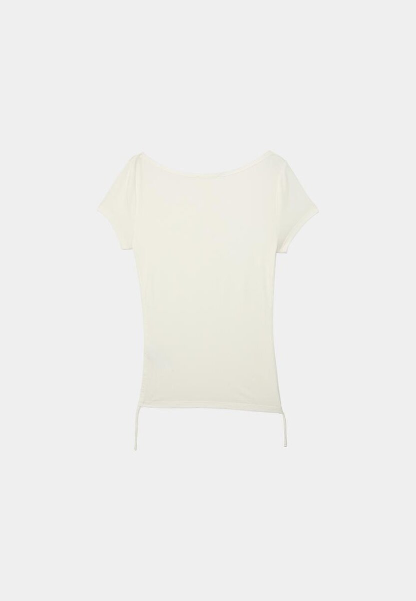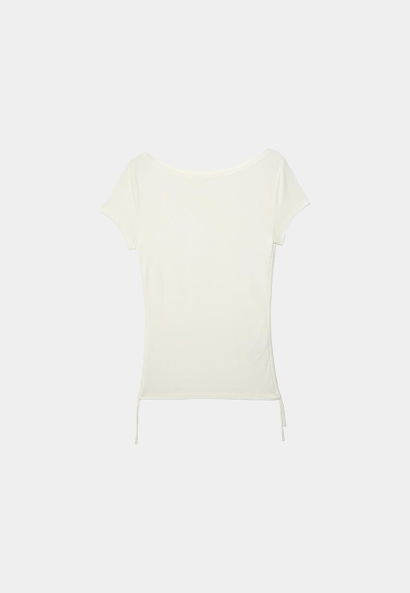 T-shirt ajusté à col bateau. Manches courtes. Fronces réglables sur le côté. Disponible en plusieurs couleurs.