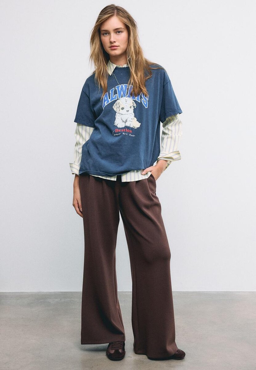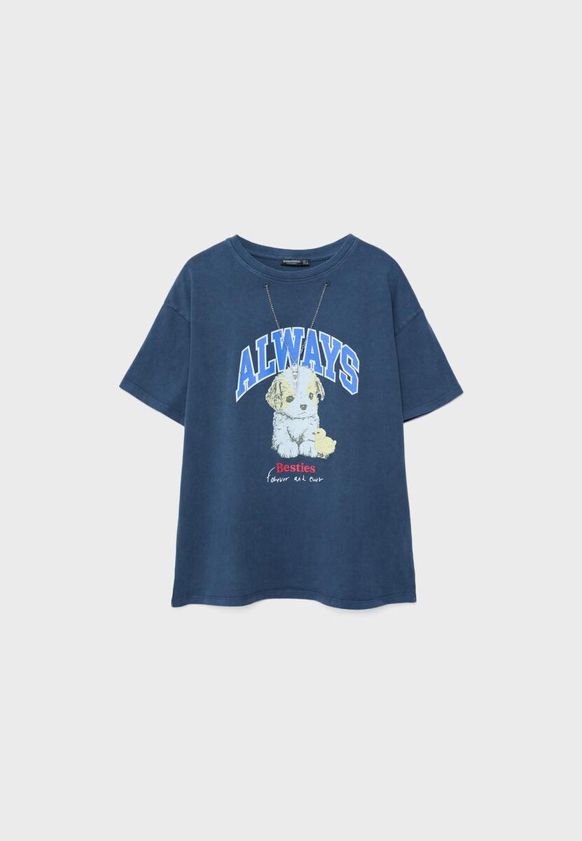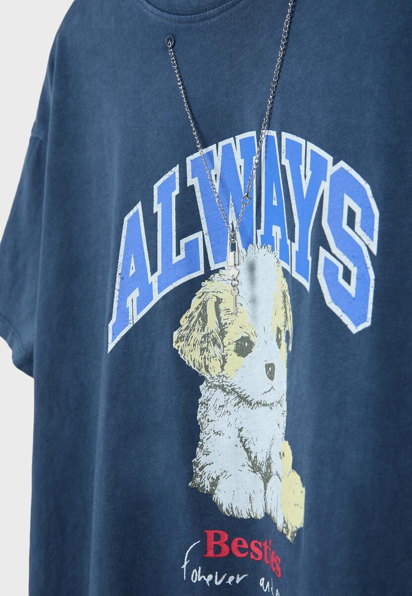 T-shirt à col rond et manches courtes. Avec imprimé sur le devant et une chaîne avec un appliqué amovible. Disponible en plusieurs couleurs.