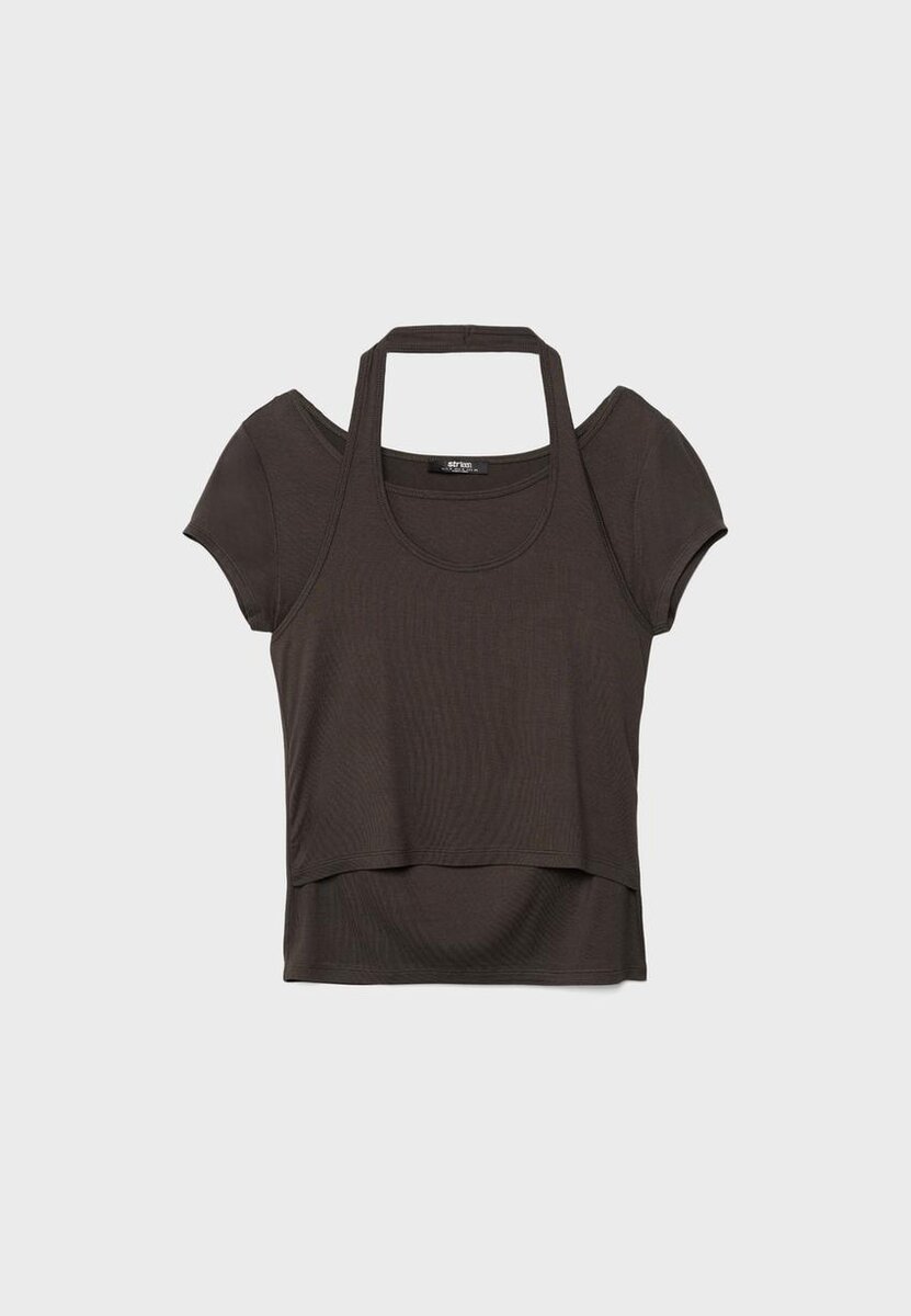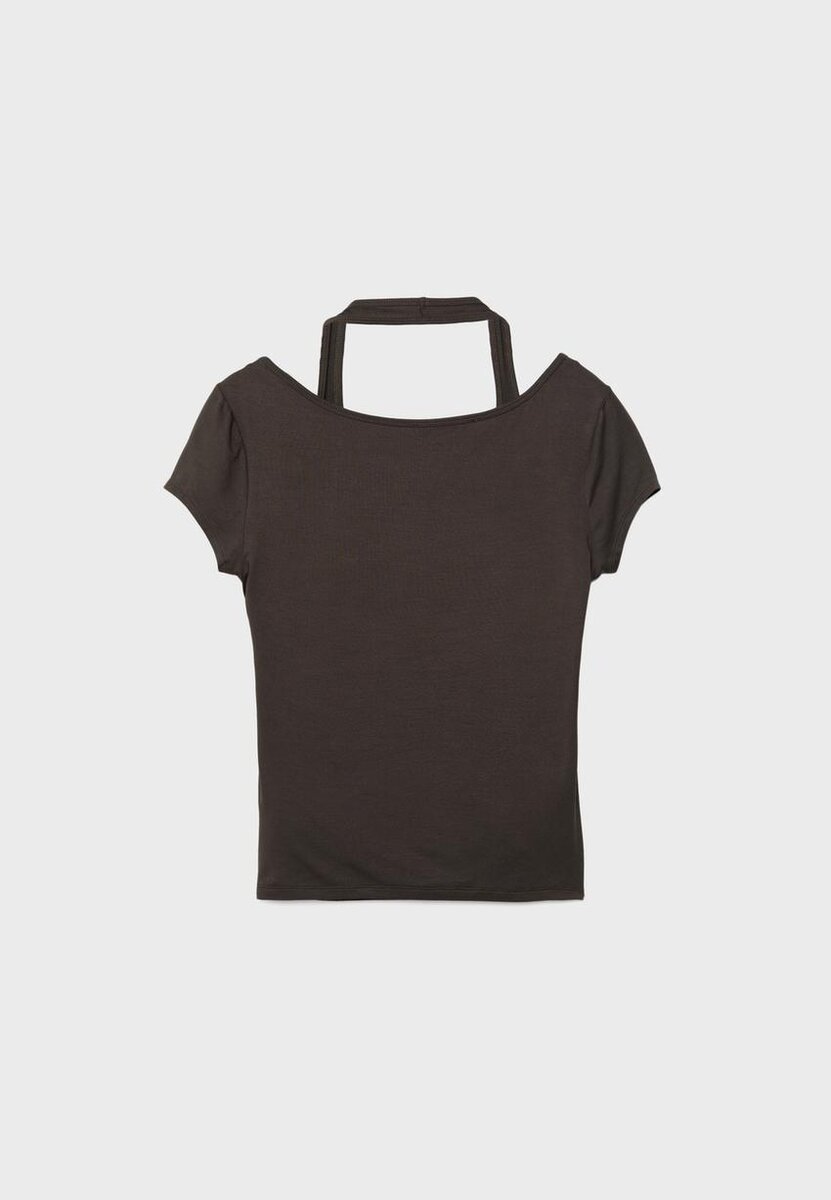 T-shirt à manches courtes et encolure bateau. Détail superposé en tissu double épaisseur ton sur ton. Disponible en plusieurs couleurs.