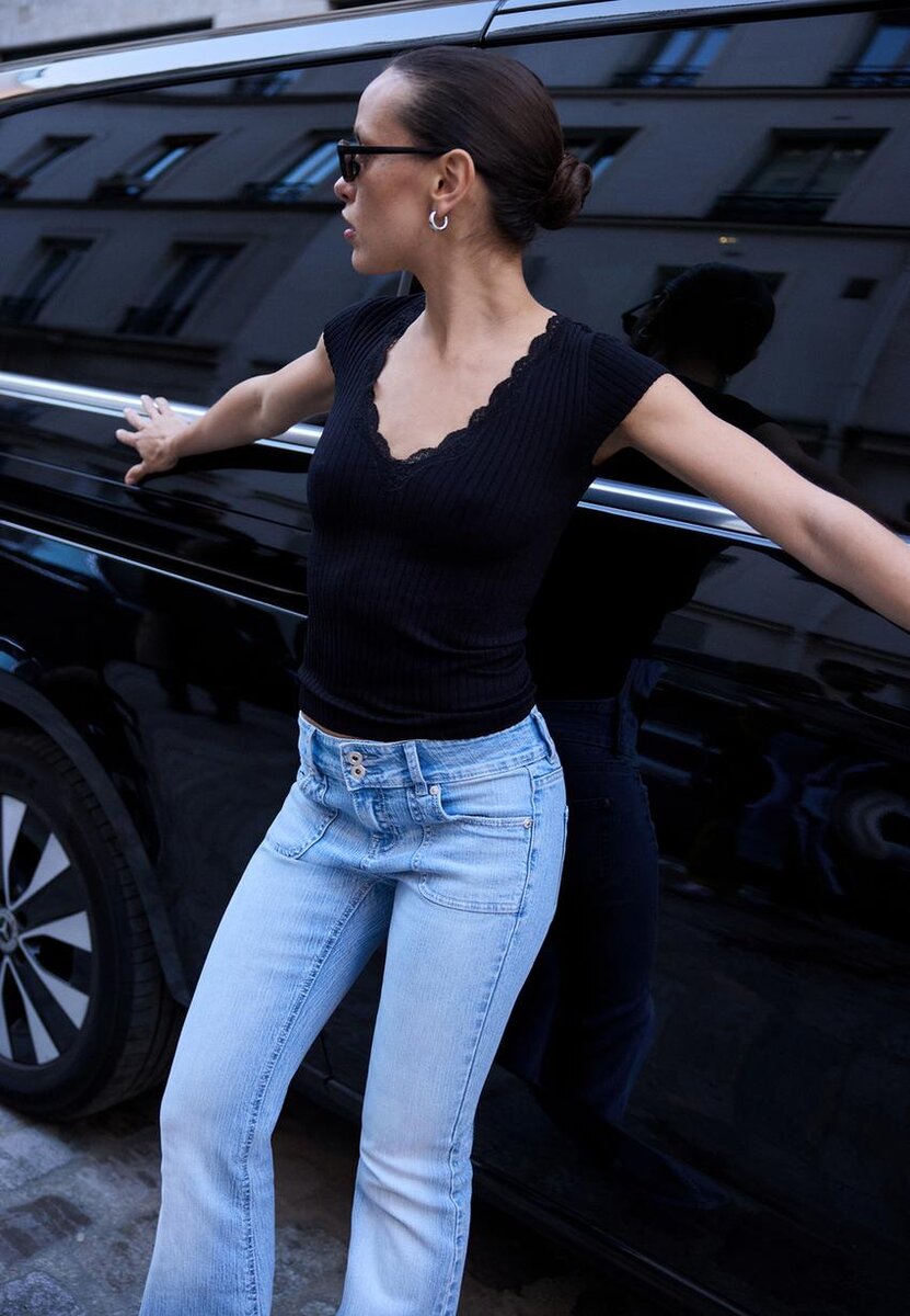 T-shirt à manches courtes en dentelle et col en V chez Stradivarius pour seulement 25,9 $ Disponible pour une durée limitée. Mocacos Nuevo pour femmes Toujours à la mode, venez découvrir dès maintenant !