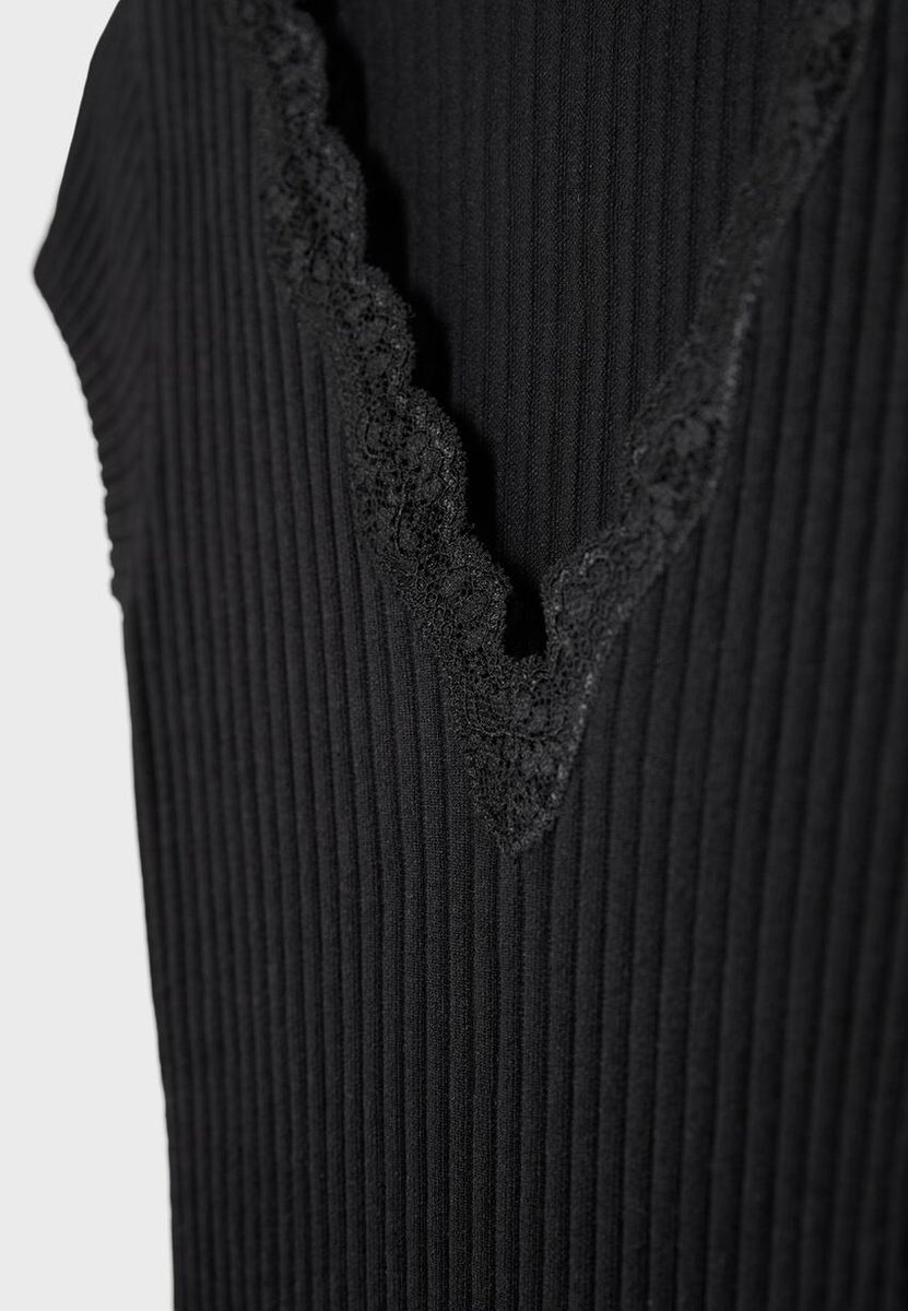 T-shirt ajusté à côtes. Col en V avec détail en dentelle et manches courtes. Disponible dans une gamme de couleurs.