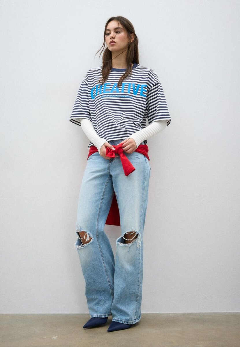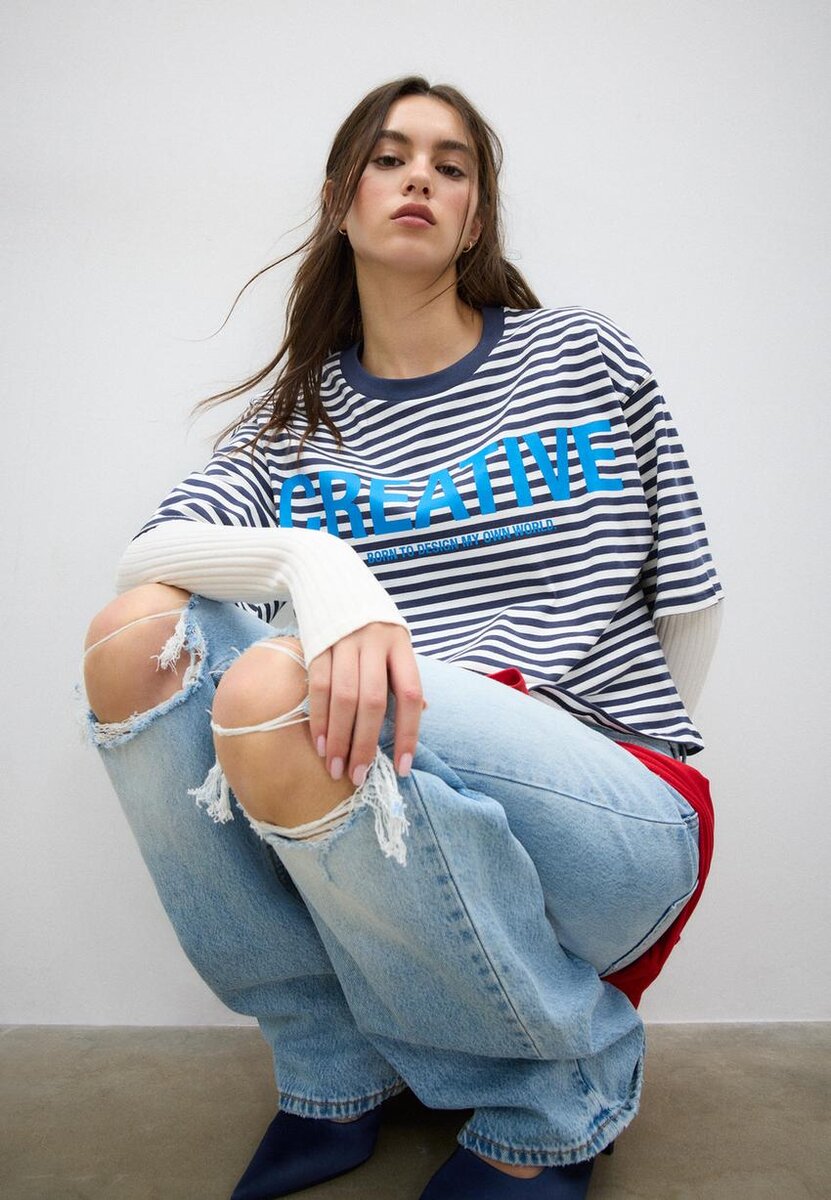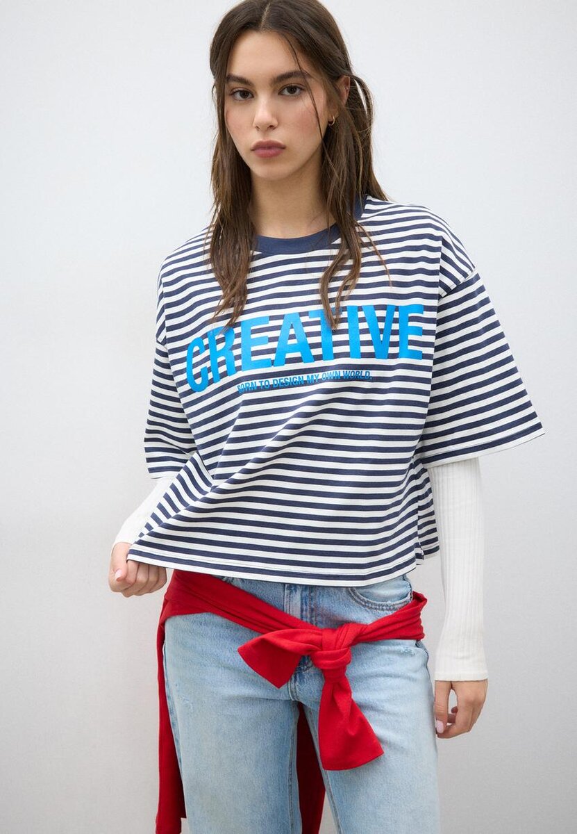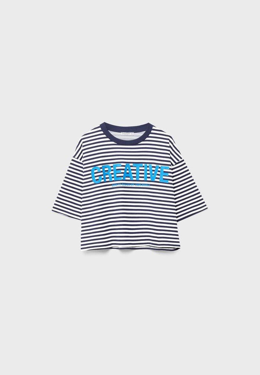 T-shirt coupe classique. Col rond avec contraste de couleur et manches courtes. Imprimé sur le devant. Disponible en plusieurs couleurs.