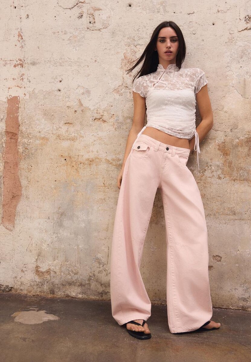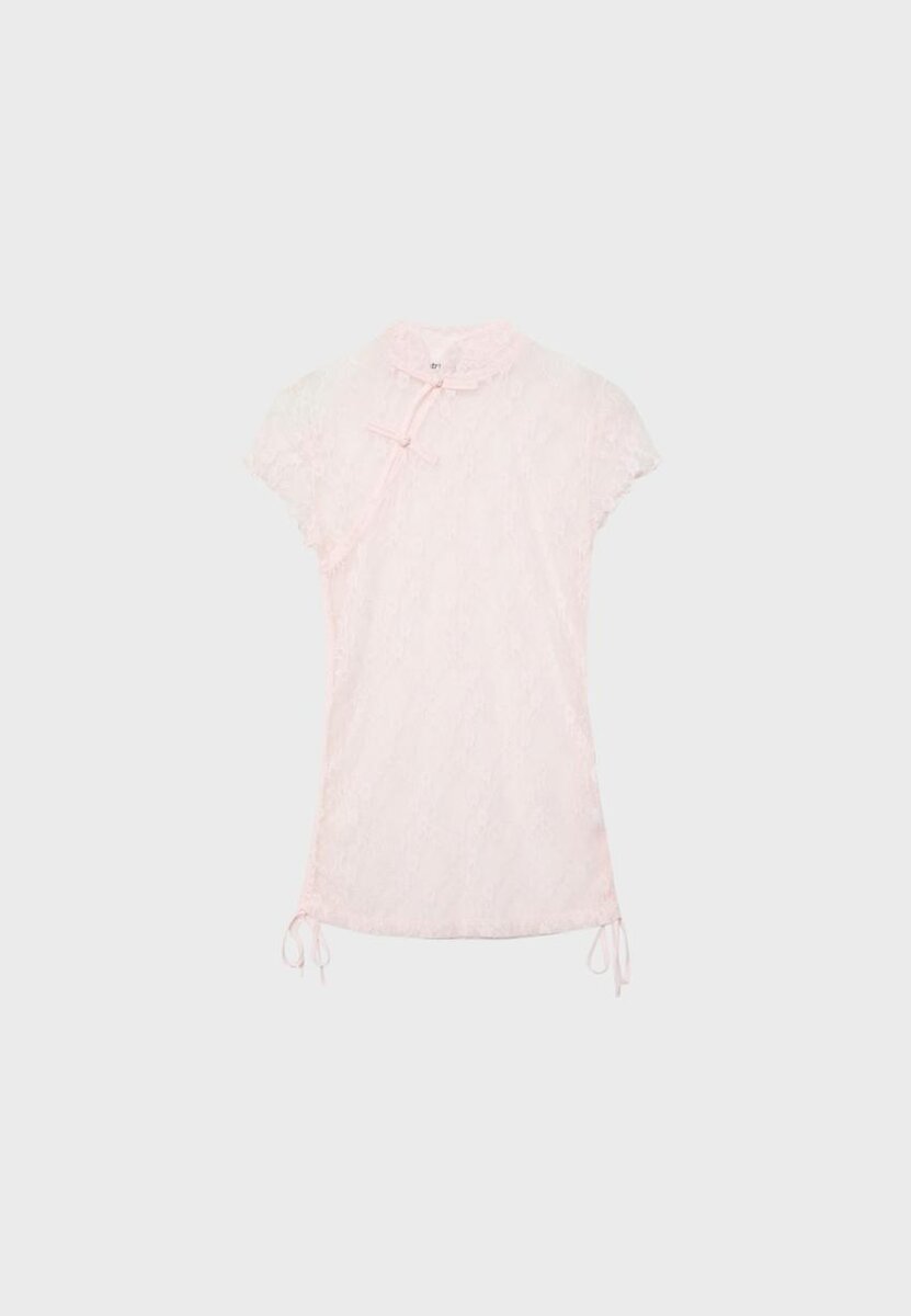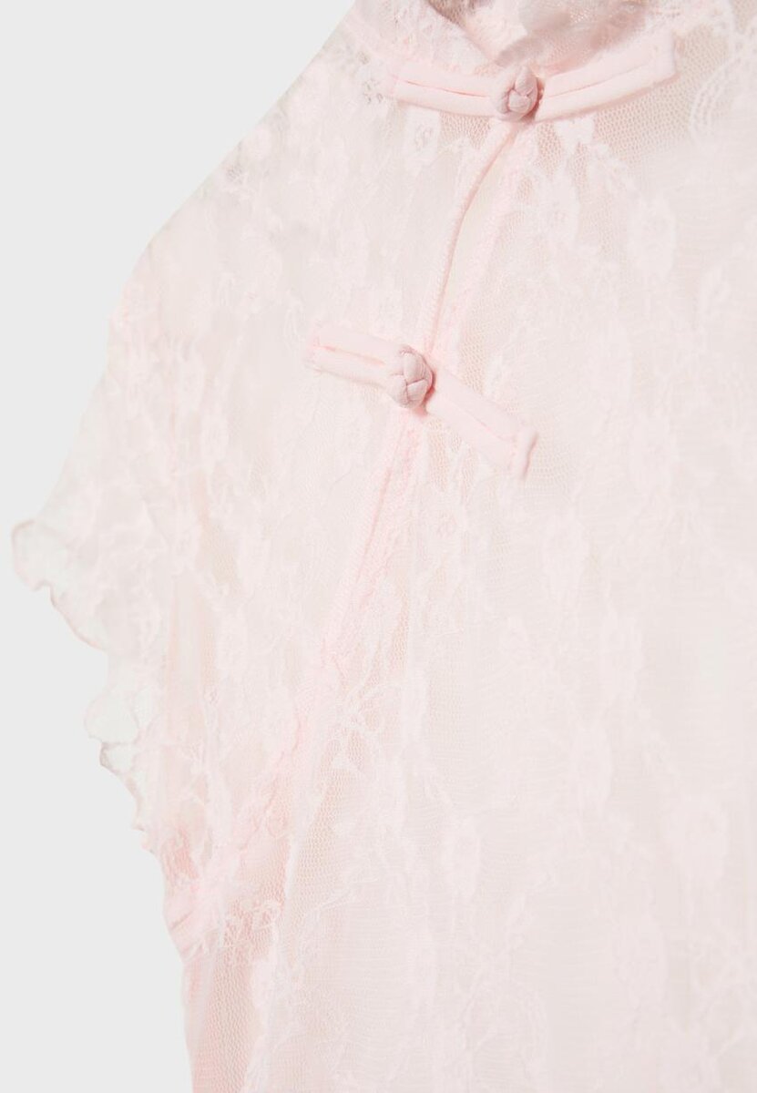 T-shirt ajusté en dentelle. Col montant et manches courtes. Fermeture à l’avant avec des boucles au niveau du cou. Ourlet ajustable avec des liens sur les côtés. Disponible en plusieurs couleurs.