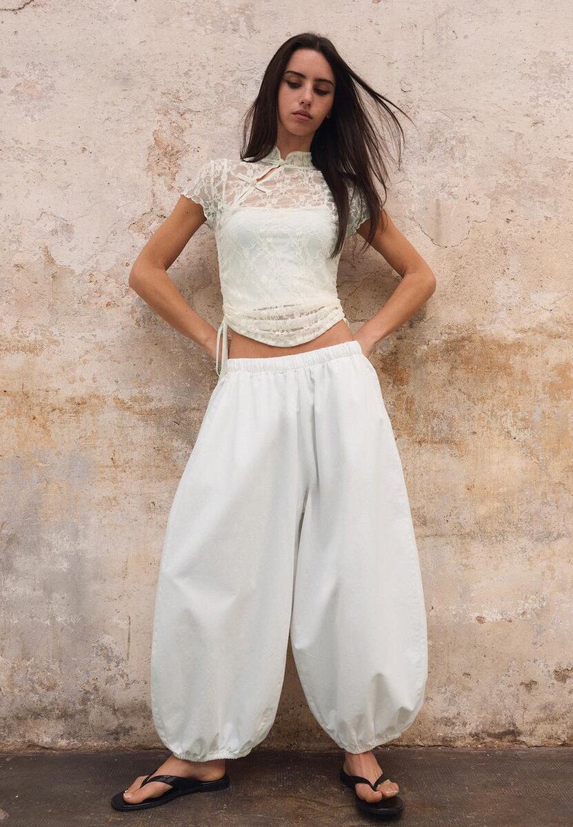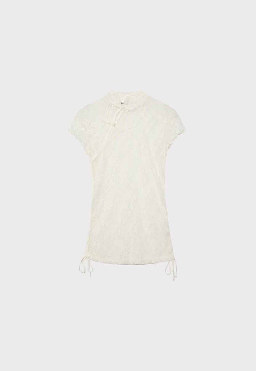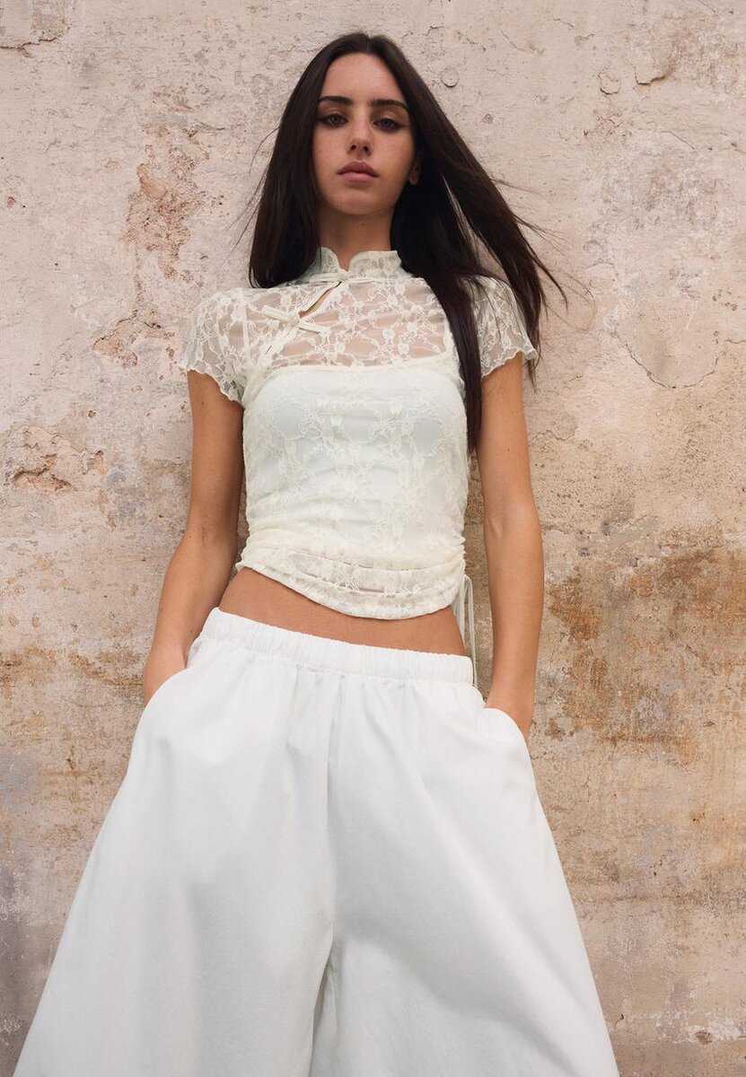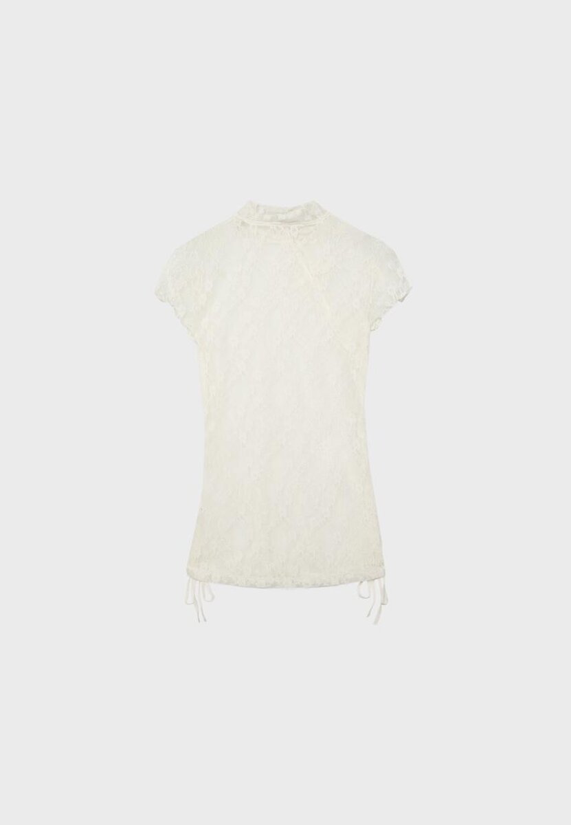 T-shirt ajusté en dentelle. Col montant et manches courtes. Fermeture à l’avant avec des boucles au niveau du cou. Ourlet ajustable avec des liens sur les côtés. Disponible en plusieurs couleurs.