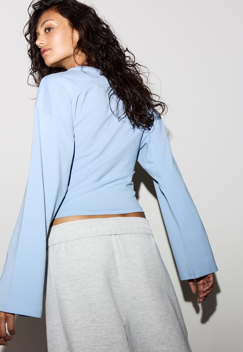 T-shirt à col rond et manches longues avec une finition Flared. Disponible en plusieurs couleurs.