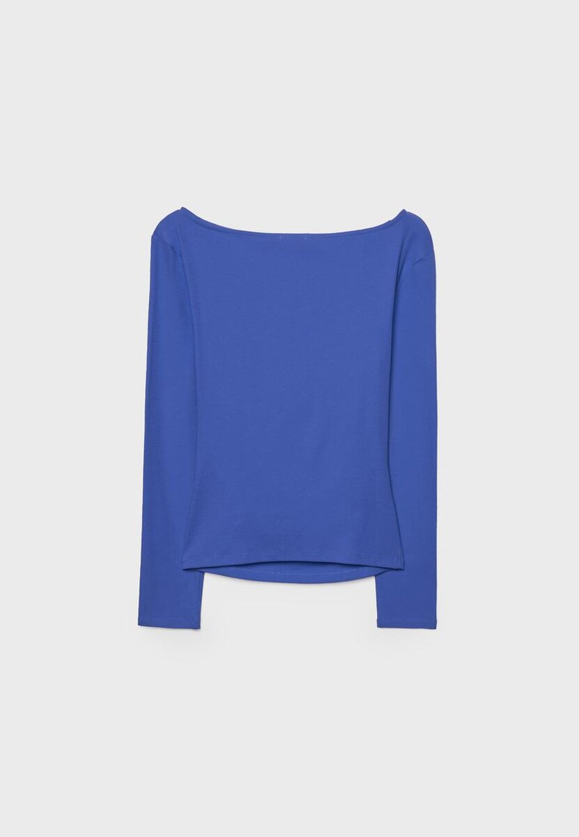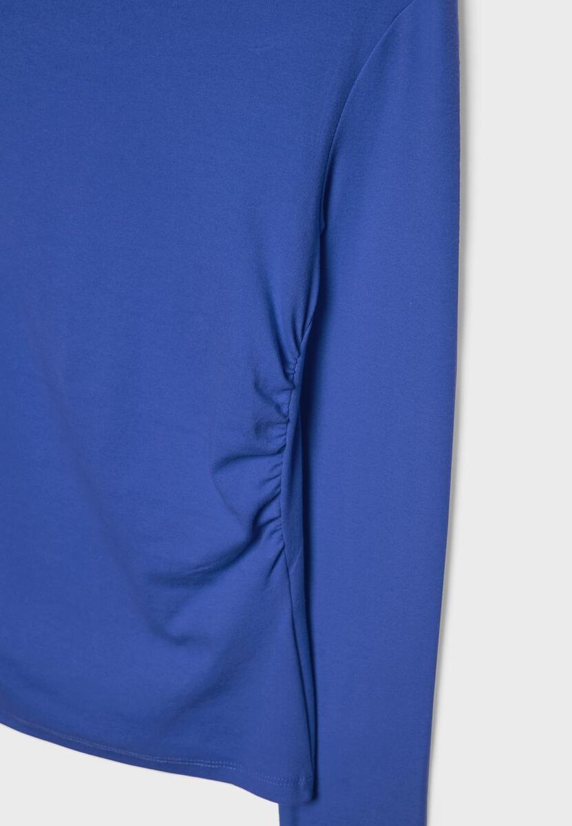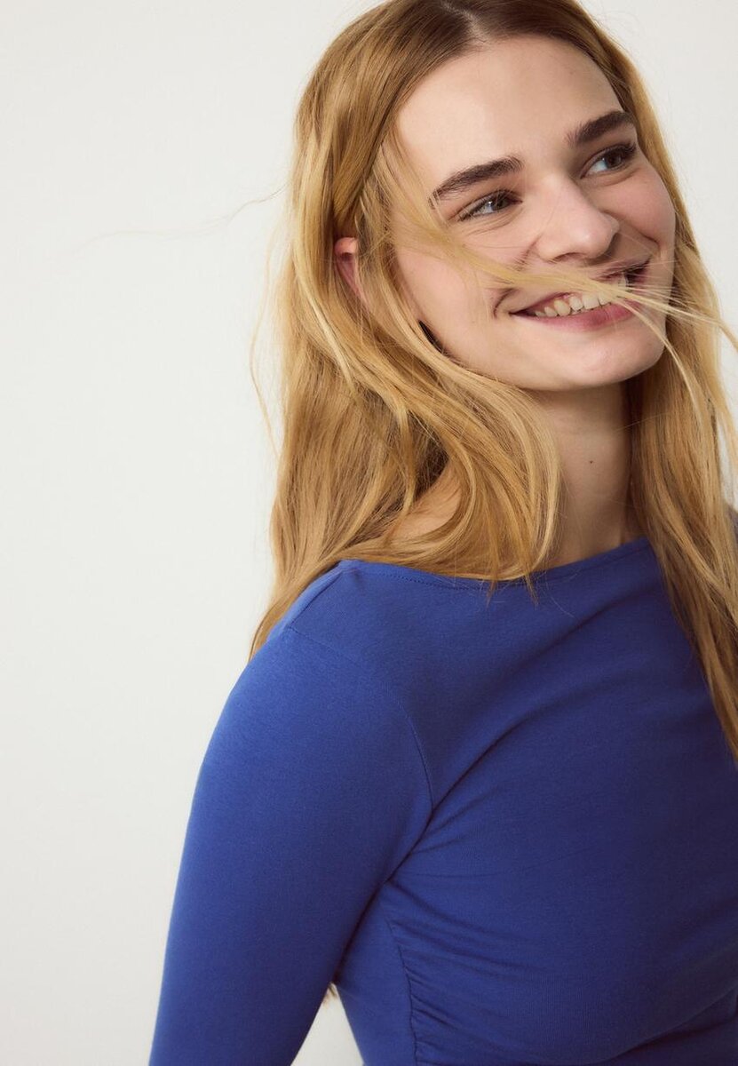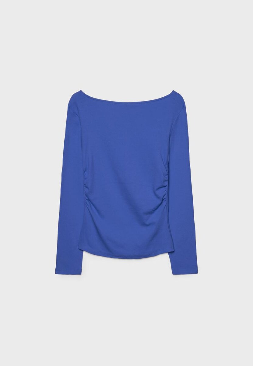T-shirt à manches longues avec encolure bateau et fronces sur les côtés. Disponible en plusieurs couleurs.
