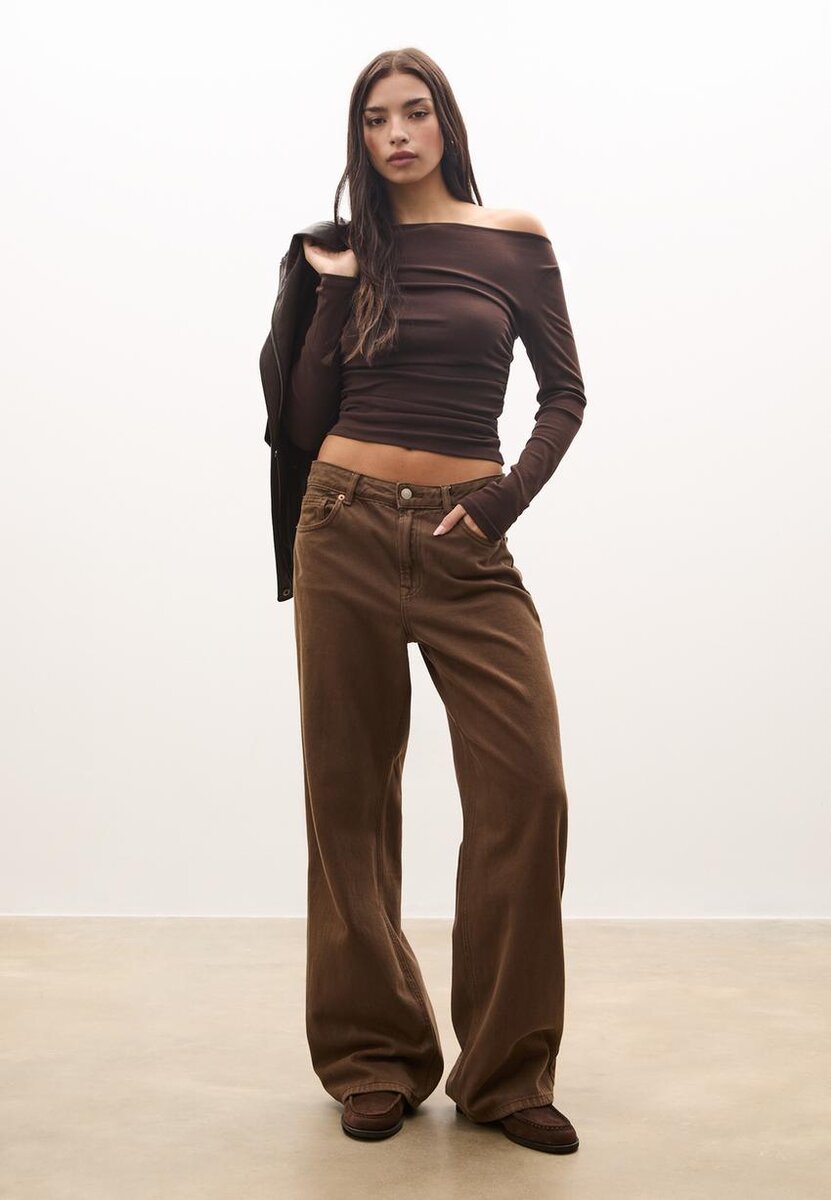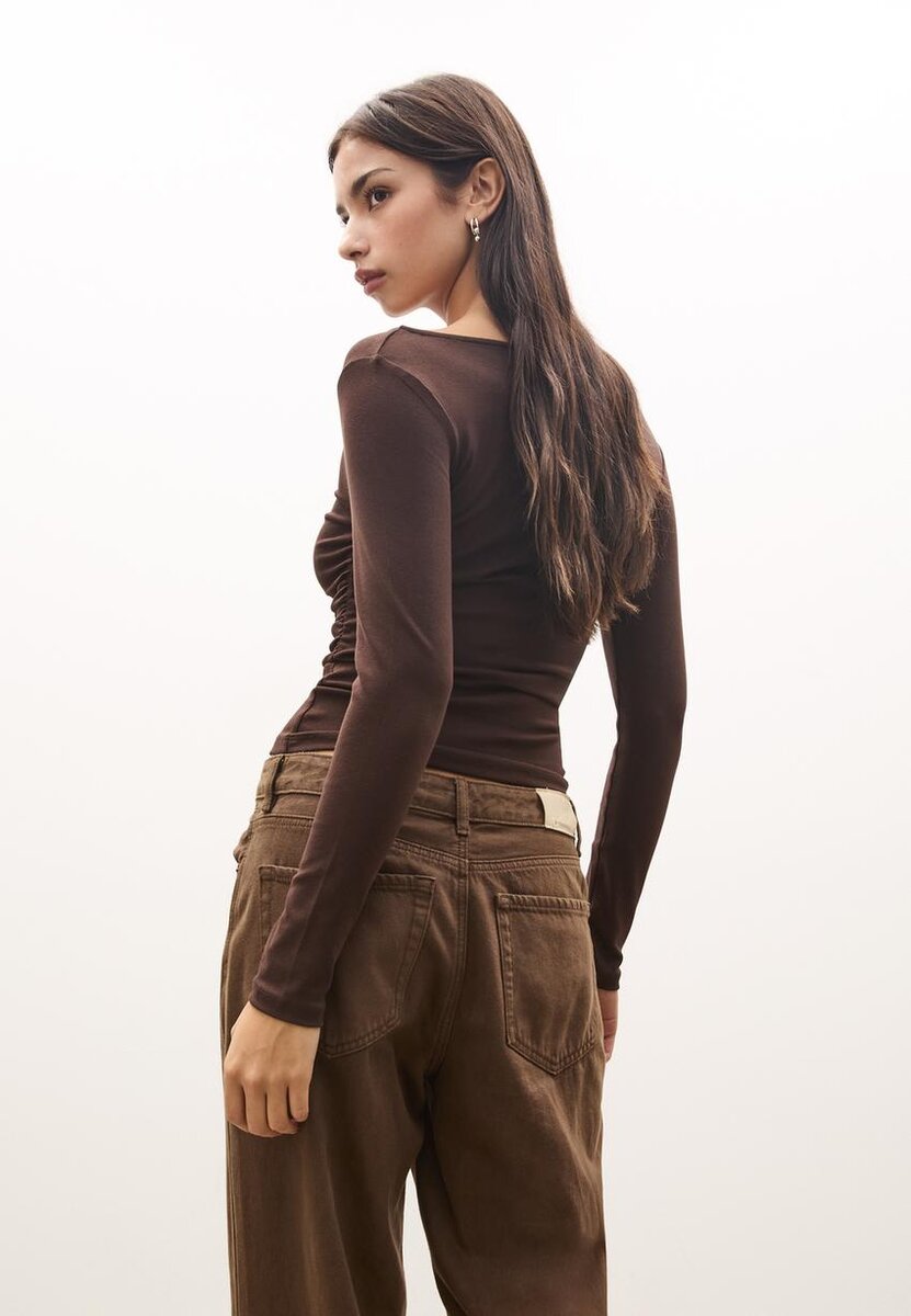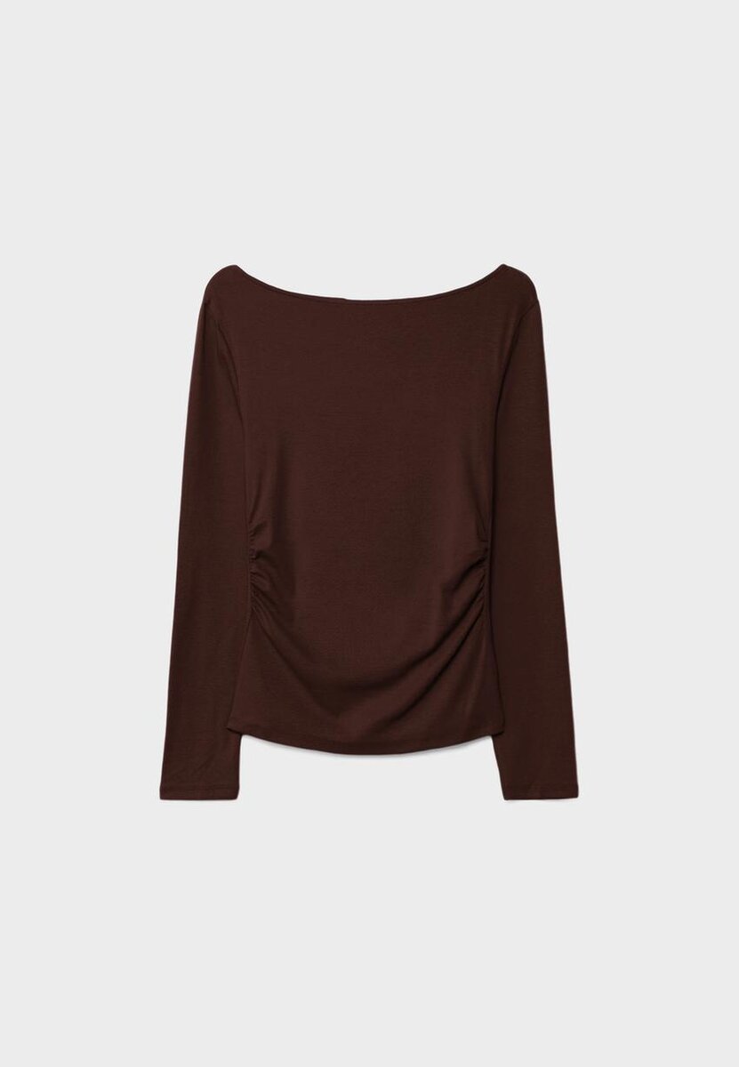 T-shirt à manches longues avec encolure bateau et fronces sur les côtés. Disponible en plusieurs couleurs.