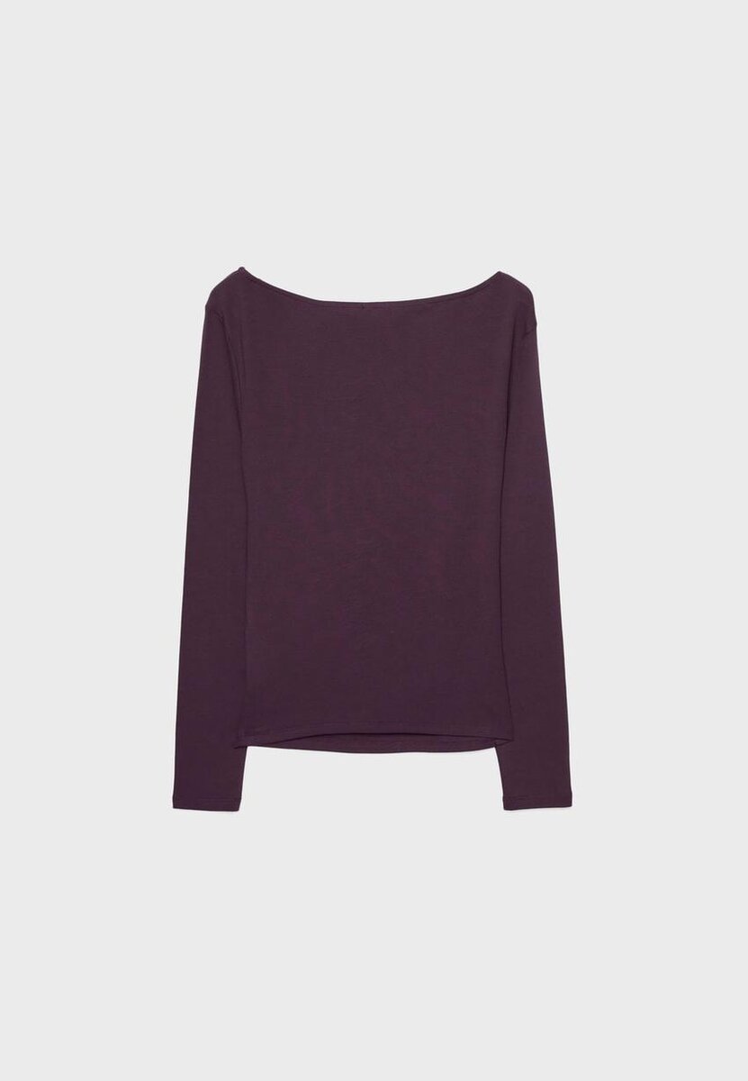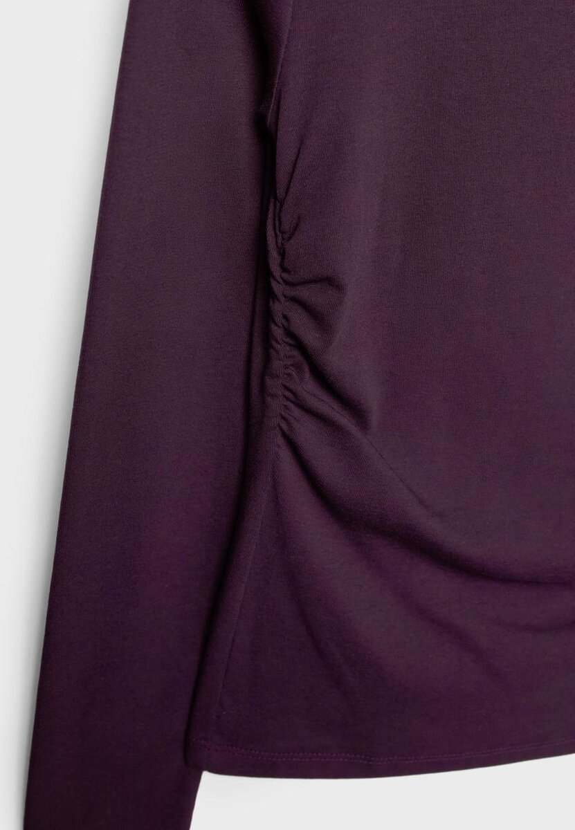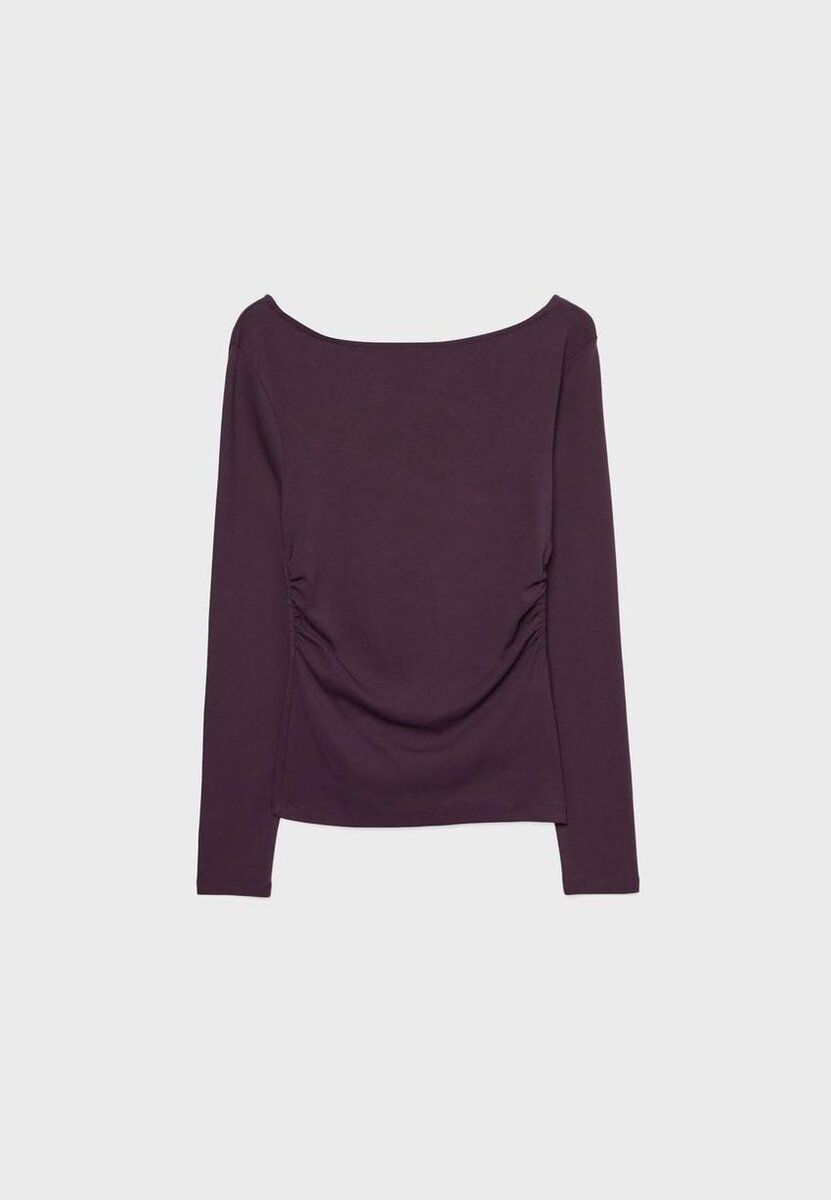 T-shirt à manches longues avec encolure bateau et fronces sur les côtés. Disponible en plusieurs couleurs.