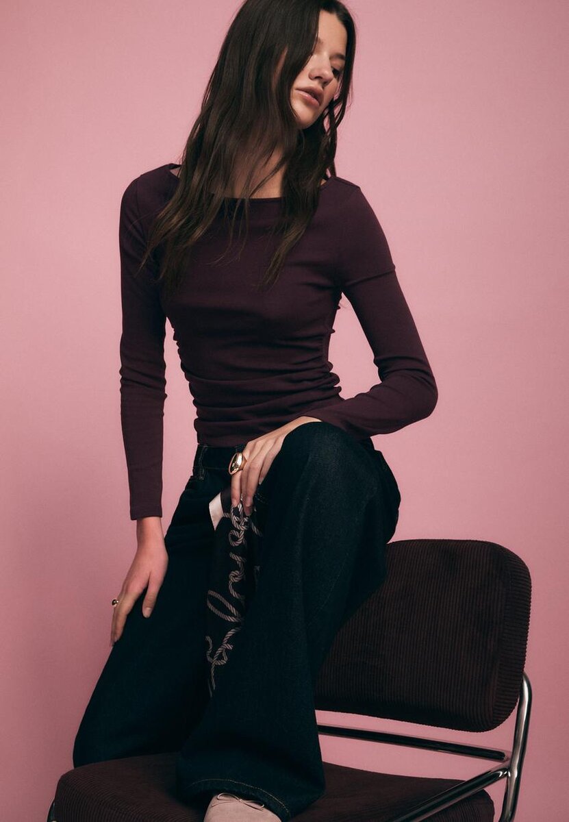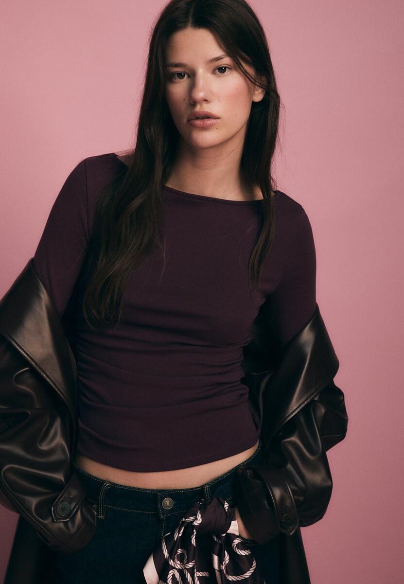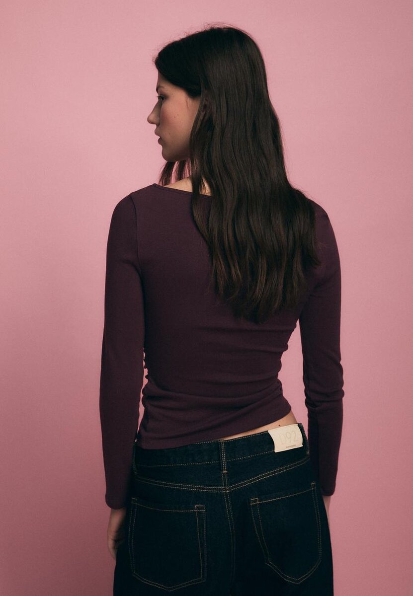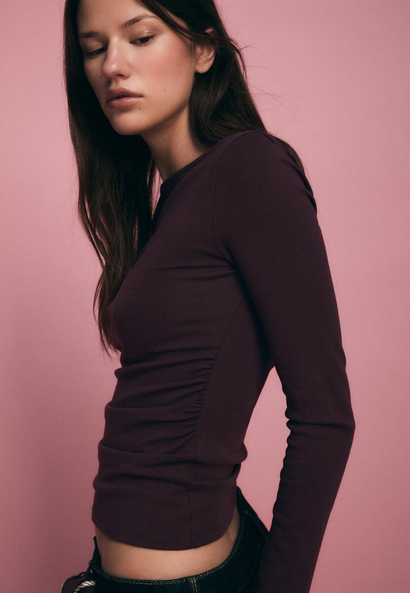 T-shirt à manches longues avec encolure bateau et fronces sur les côtés. Disponible en plusieurs couleurs.