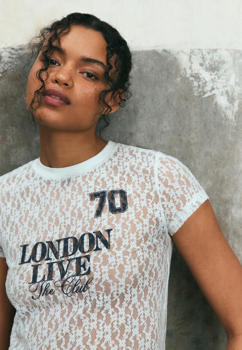 T-shirt ajusté avec dentelle et motif graphique chez Stradivarius pour seulement 29,9 $ Disponible pour une durée limitée. Null pour femmes Toujours tendance, venez le découvrir dès maintenant !