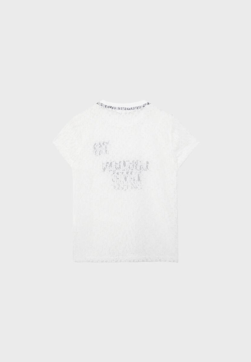 Haut ajusté en dentelle. Col rond et manches courtes. Imprimé graphique sur le devant.