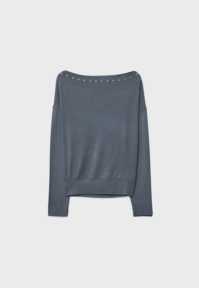 T-shirt à manches longues, coupe asymétrique et épaules dénudées. Détails clous. Disponible en plusieurs couleurs.