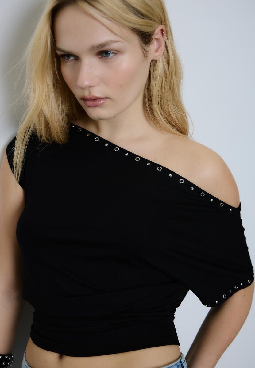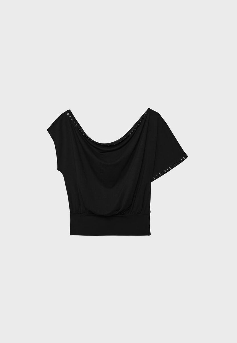 T-shirt à col asymétrique et manches courtes. Ourlet ajusté. Détail clous. Disponible en plusieurs couleurs.