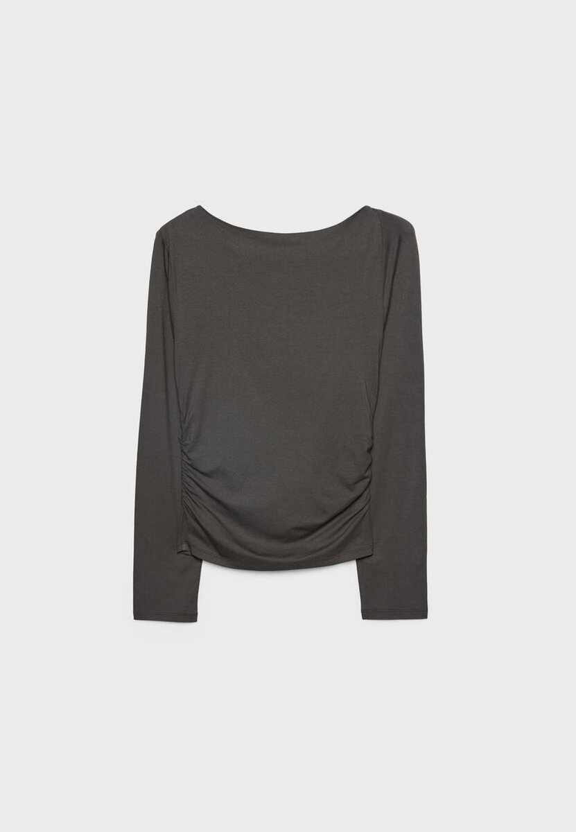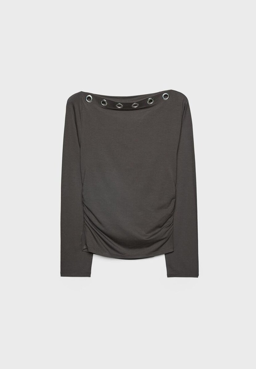 T-shirt ajusté à encolure asymétrique et manches longues, laissant une épaule dénudée. Œillets métalliques sur le devant et tissu froncé sur les côtés. Disponible en plusieurs couleurs.