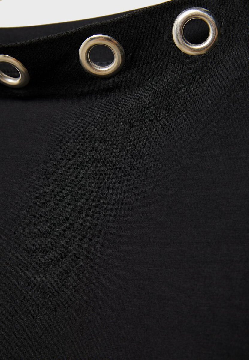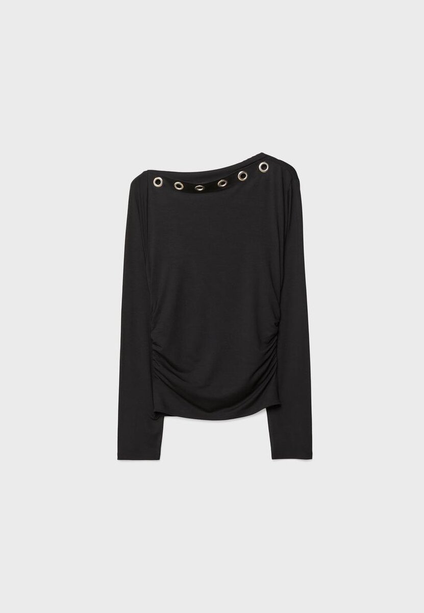 T-shirt ajusté à encolure asymétrique et manches longues, laissant une épaule dénudée. Œillets métalliques sur le devant et tissu froncé sur les côtés. Disponible en plusieurs couleurs.