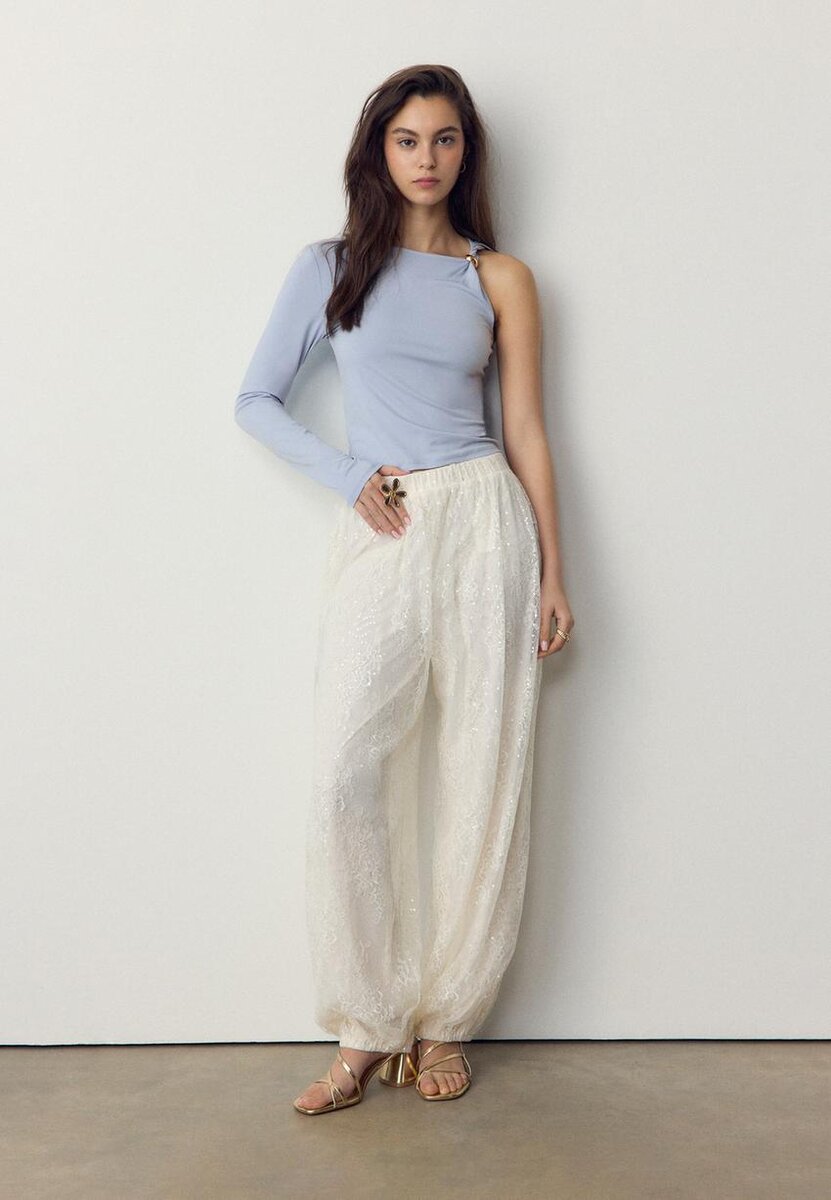 T-shirt à encolure asymétrique et manches longues. Orné d’une boucle métallique sur la bretelle. Disponible en plusieurs couleurs.