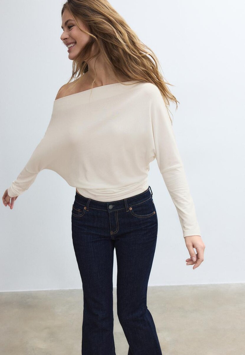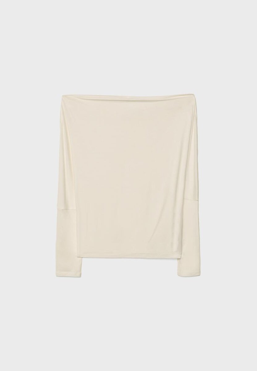 T-shirt fluide et au toucher doux. Encolure asymétrique et manches longues finies par un revers et une épaule dénudée. Disponible en plusieurs couleurs.