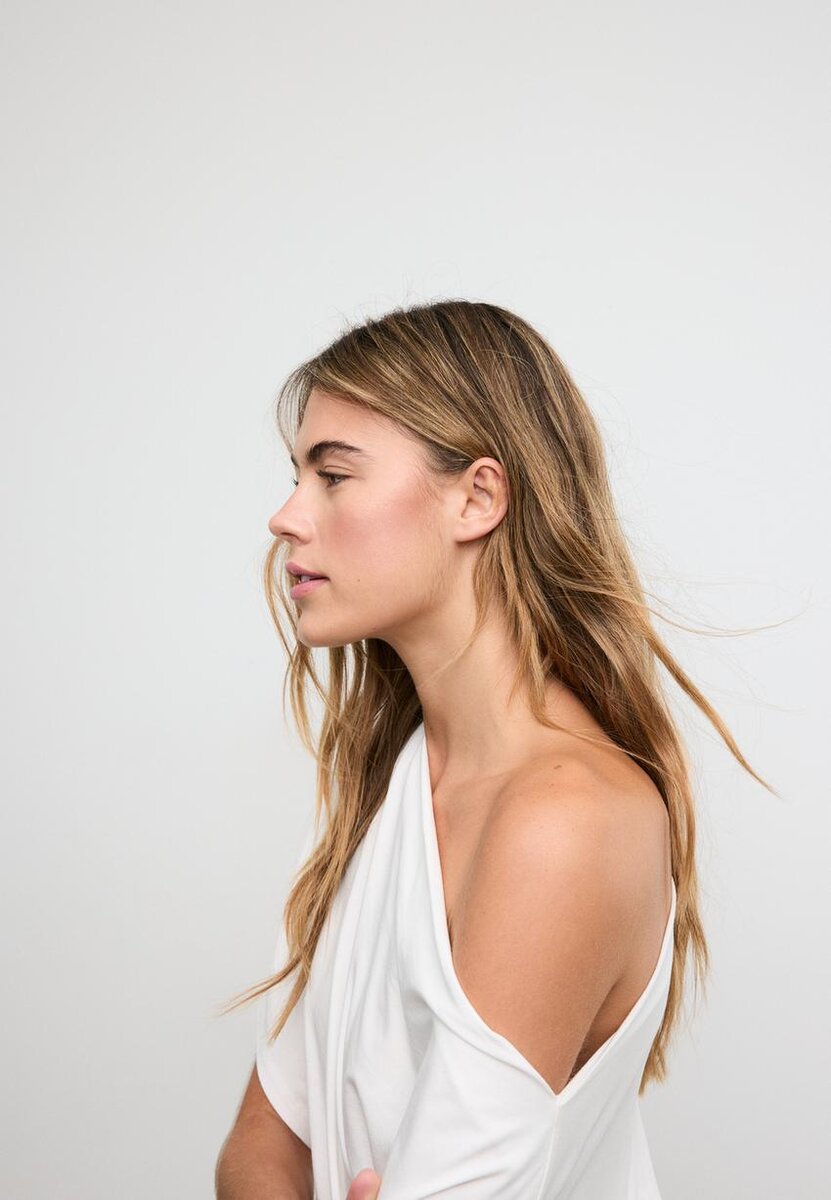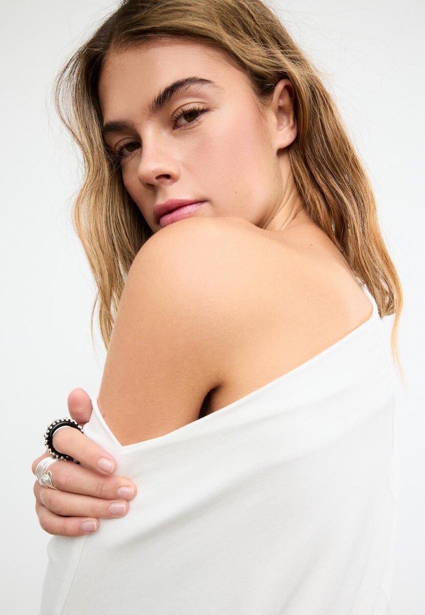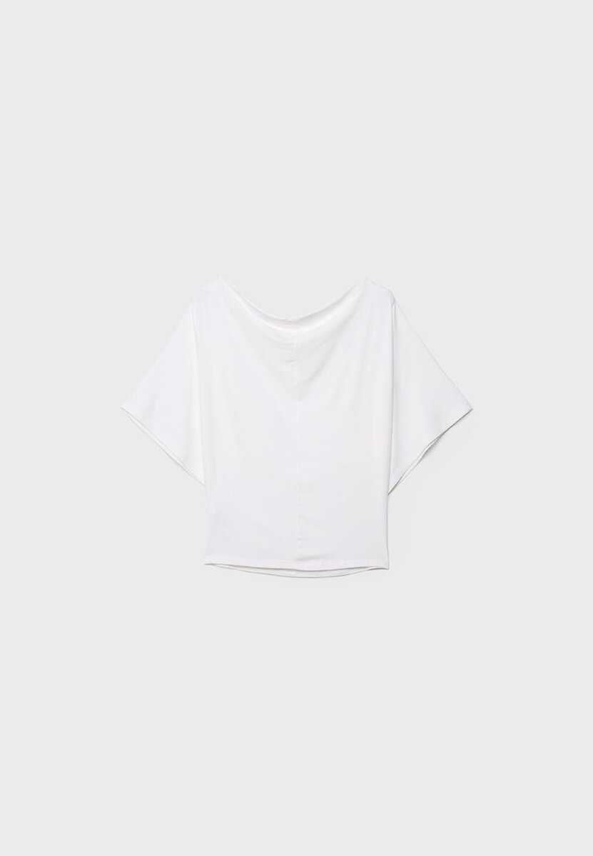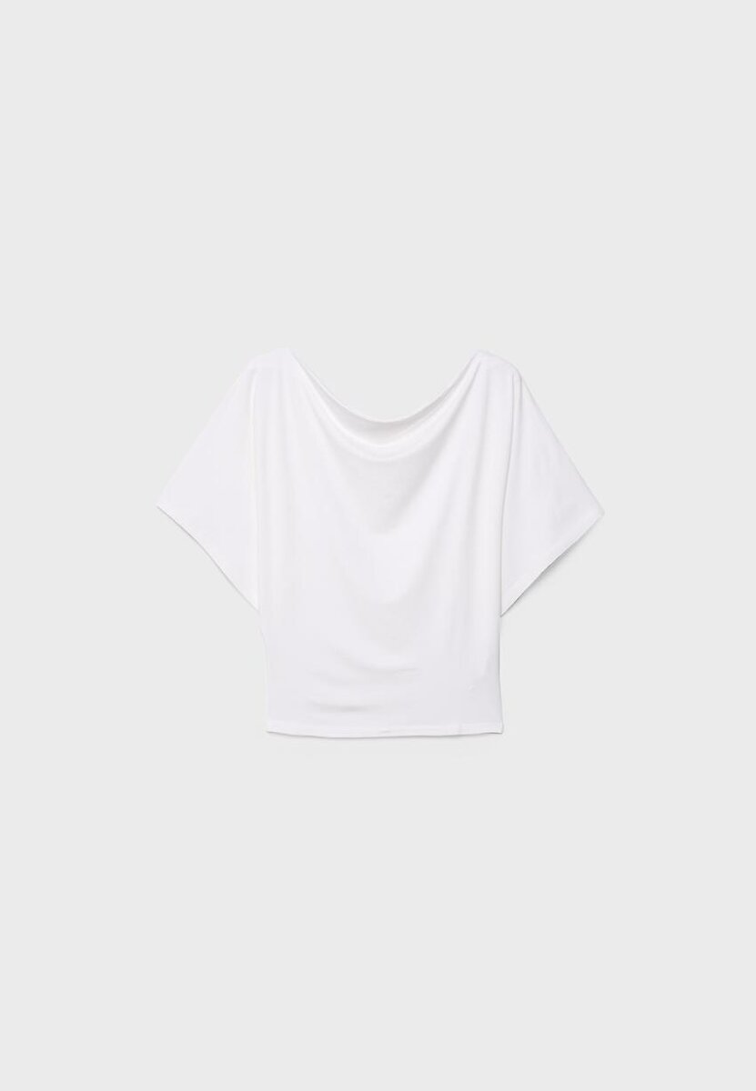 T-shirt basique à col bateau avec manches courtes larges chauve-souris. Ourlet ajusté à la taille. Disponible en plusieurs couleurs.