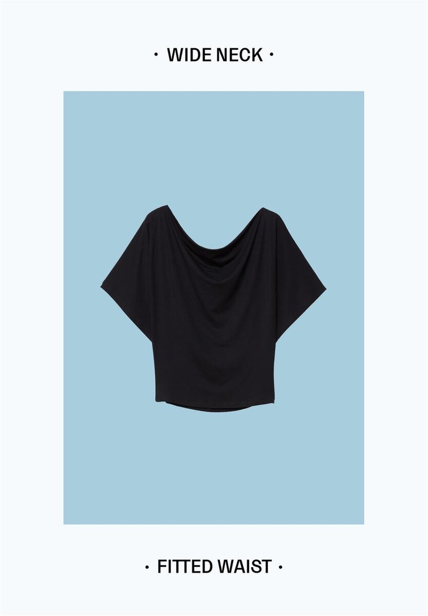 T-shirt basique à col bateau avec manches courtes et larges en forme d’ailes de chauve-souris. Ourlet ajusté à la taille. Disponible en plusieurs couleurs.