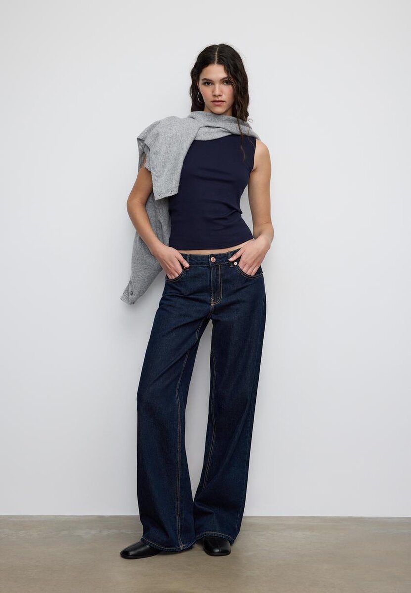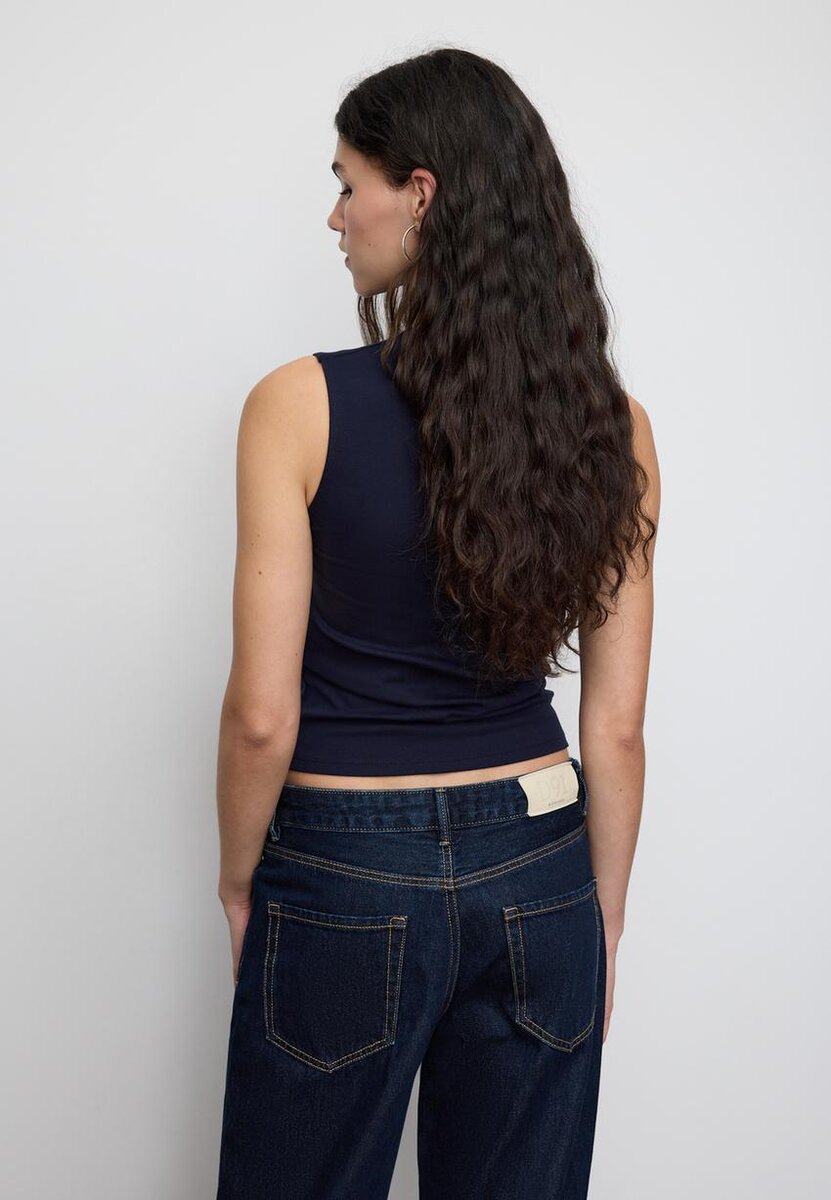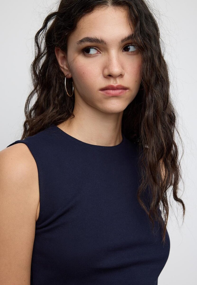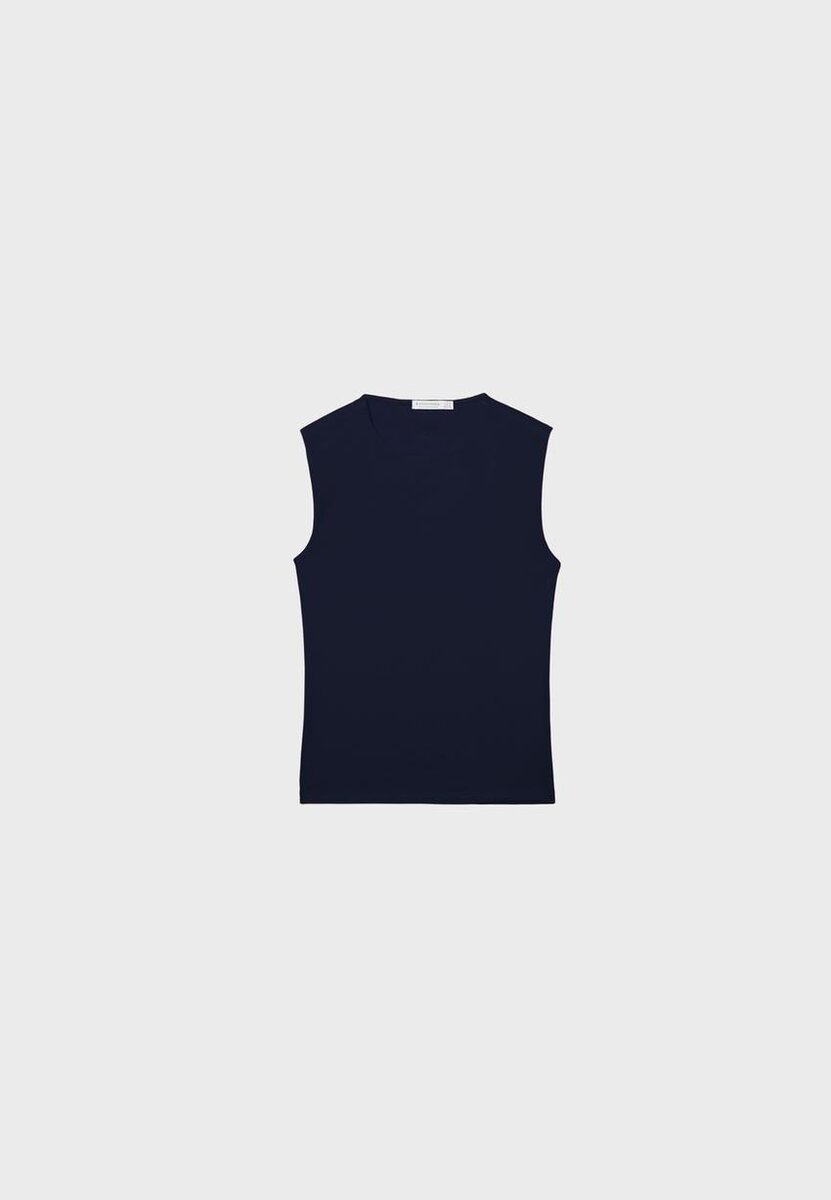 T-shirt basique à col rond. Sans manches. Disponible en plusieurs couleurs.