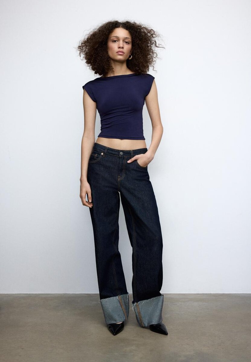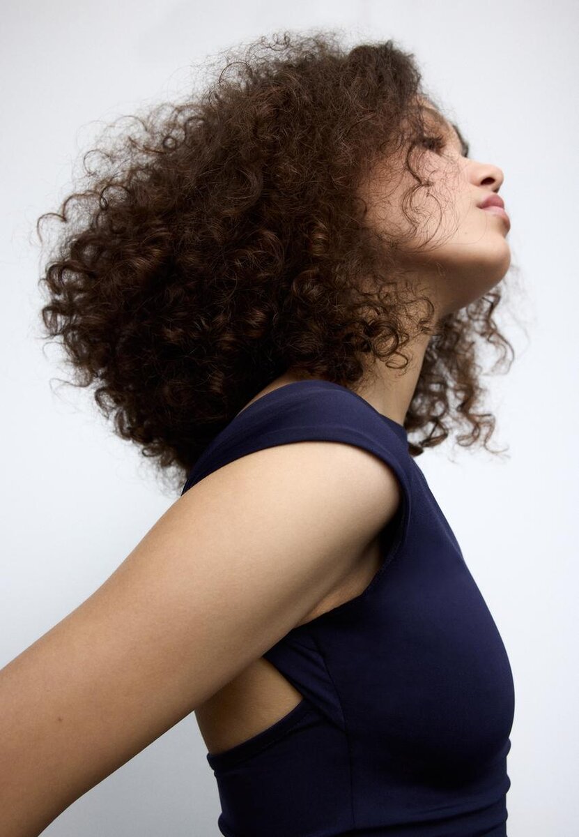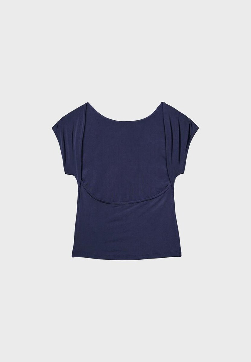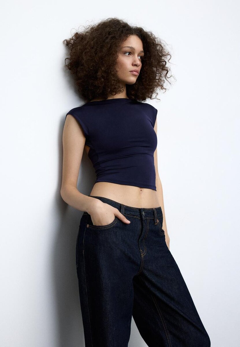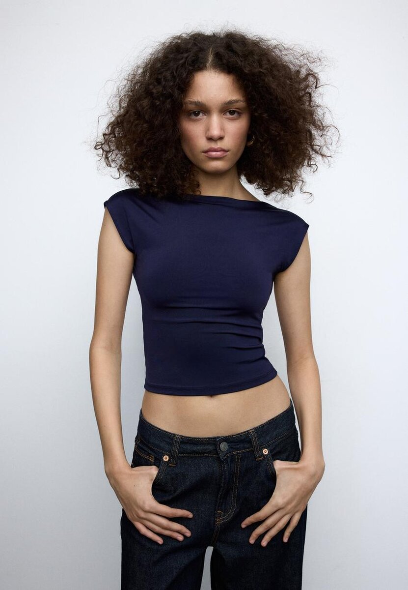 T-shirt court ajusté à manches courtes et col rond. Dos nu. Disponible dans une gamme de couleurs.