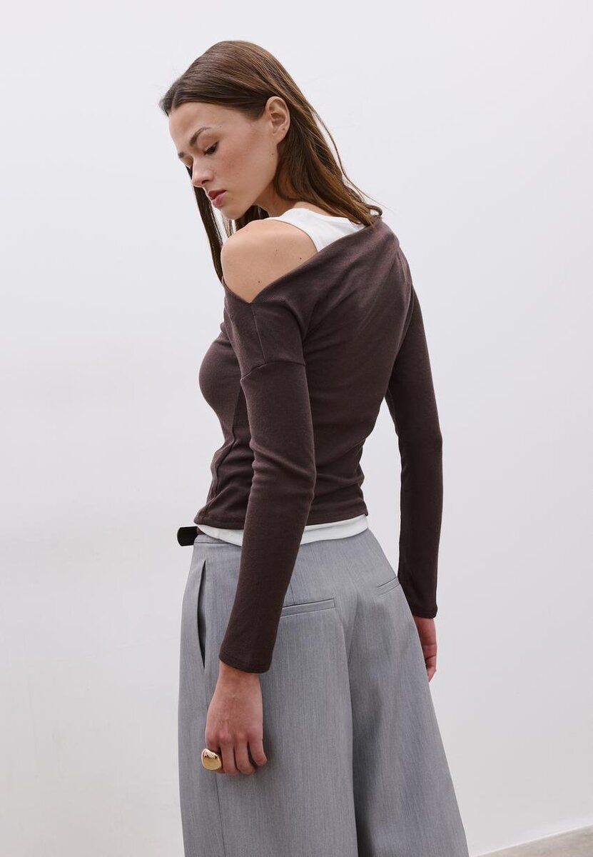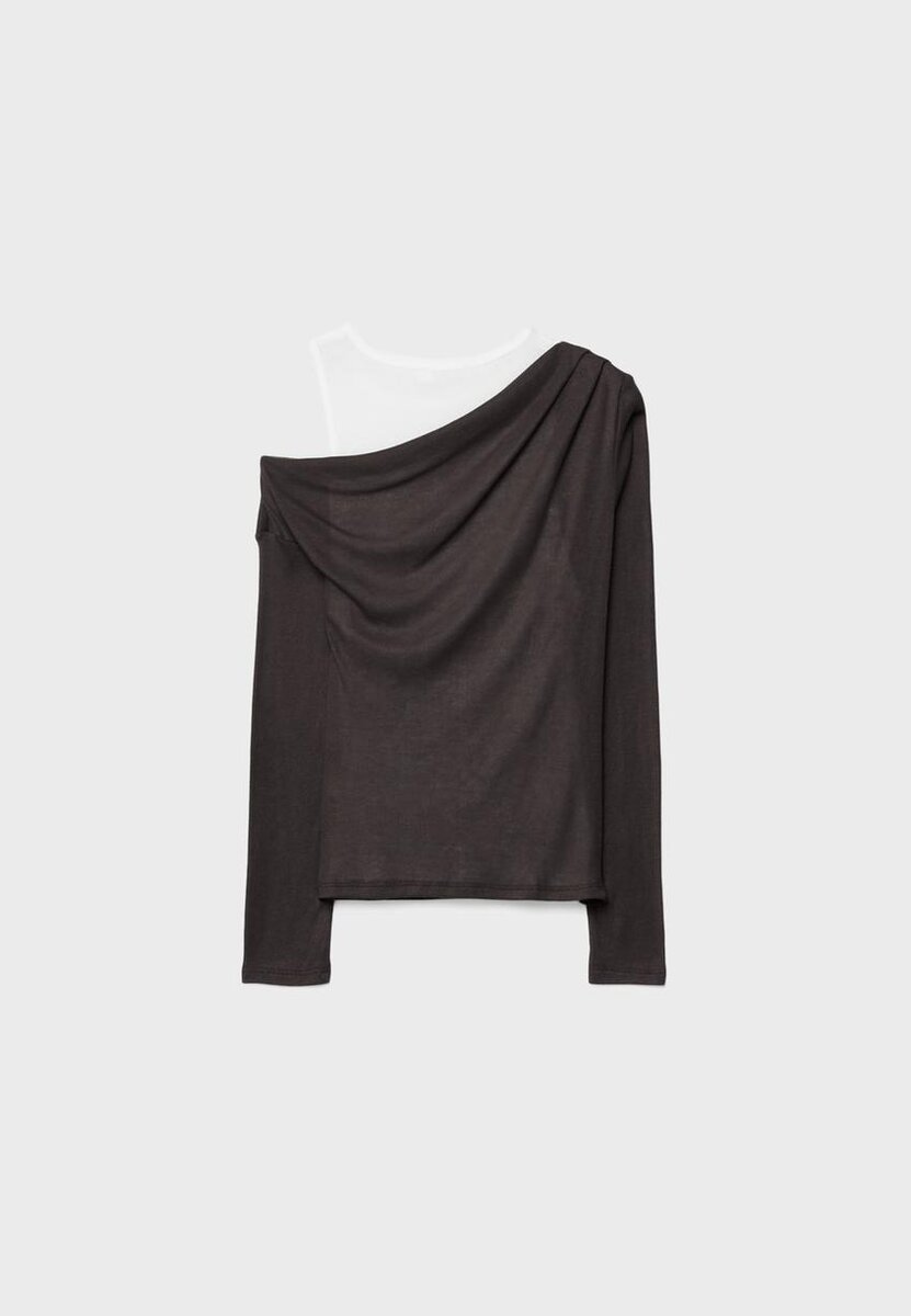 T-shirt combiné à encolure asymétrique drapée et manches longues. Comprend un t-shirt intérieur à col rond contrastant avec bretelles dos nageur. Disponible en plusieurs couleurs.