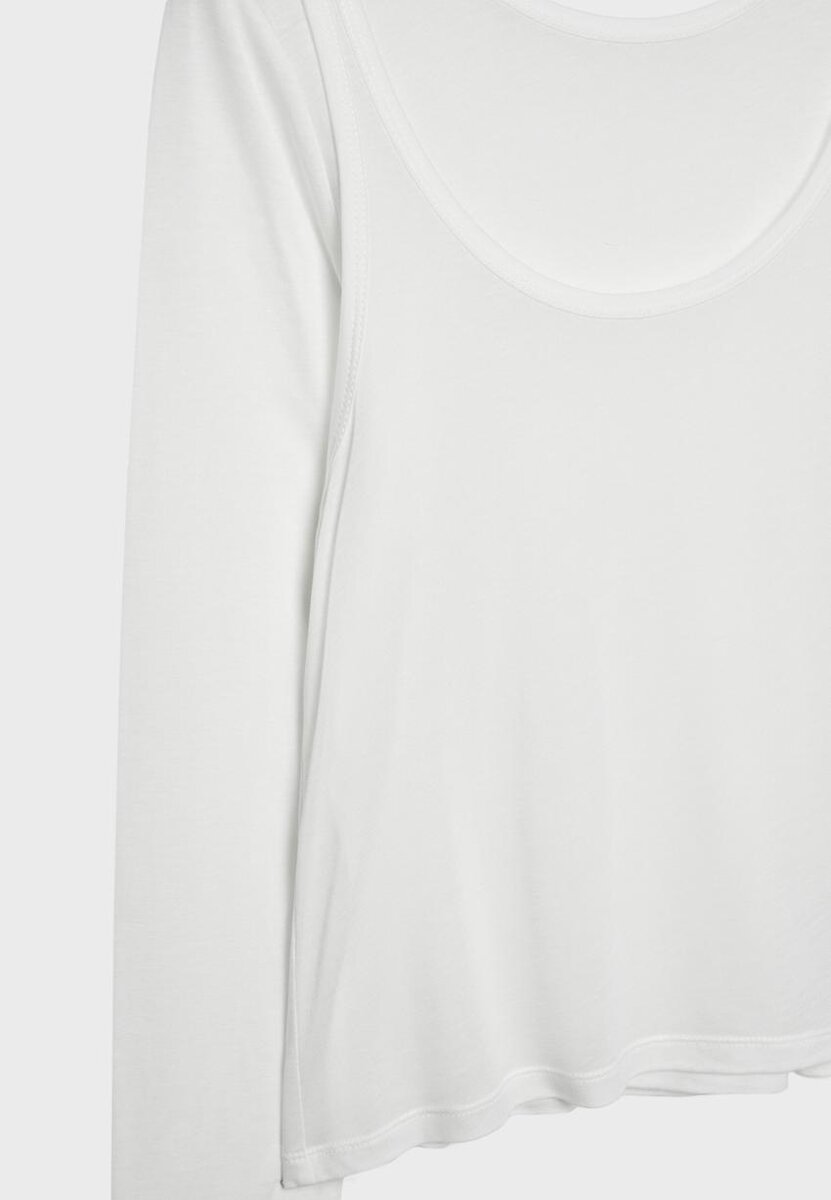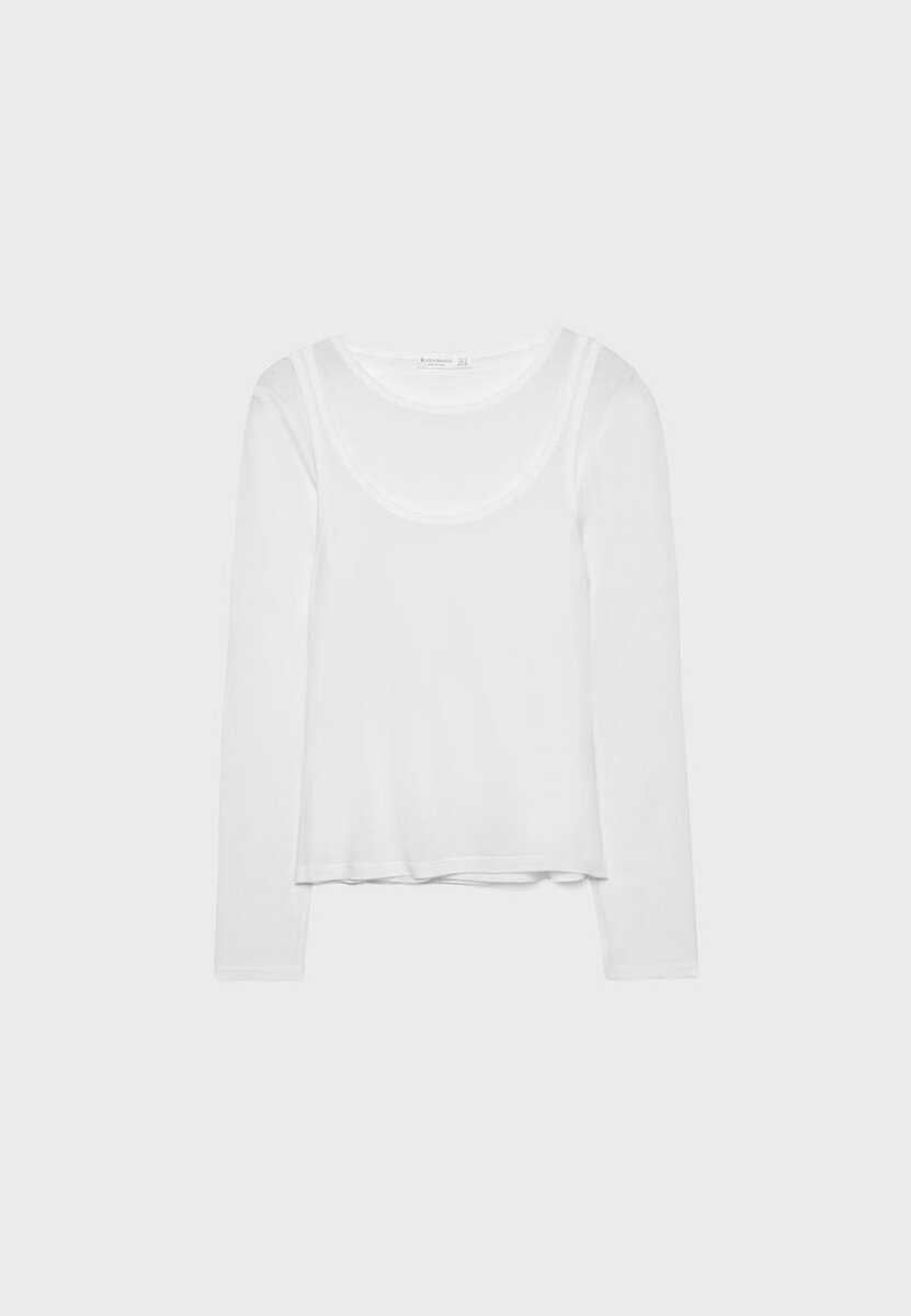 T-shirt à col rond et manches longues. Avec superposition de tissu à double effet ton sur ton.