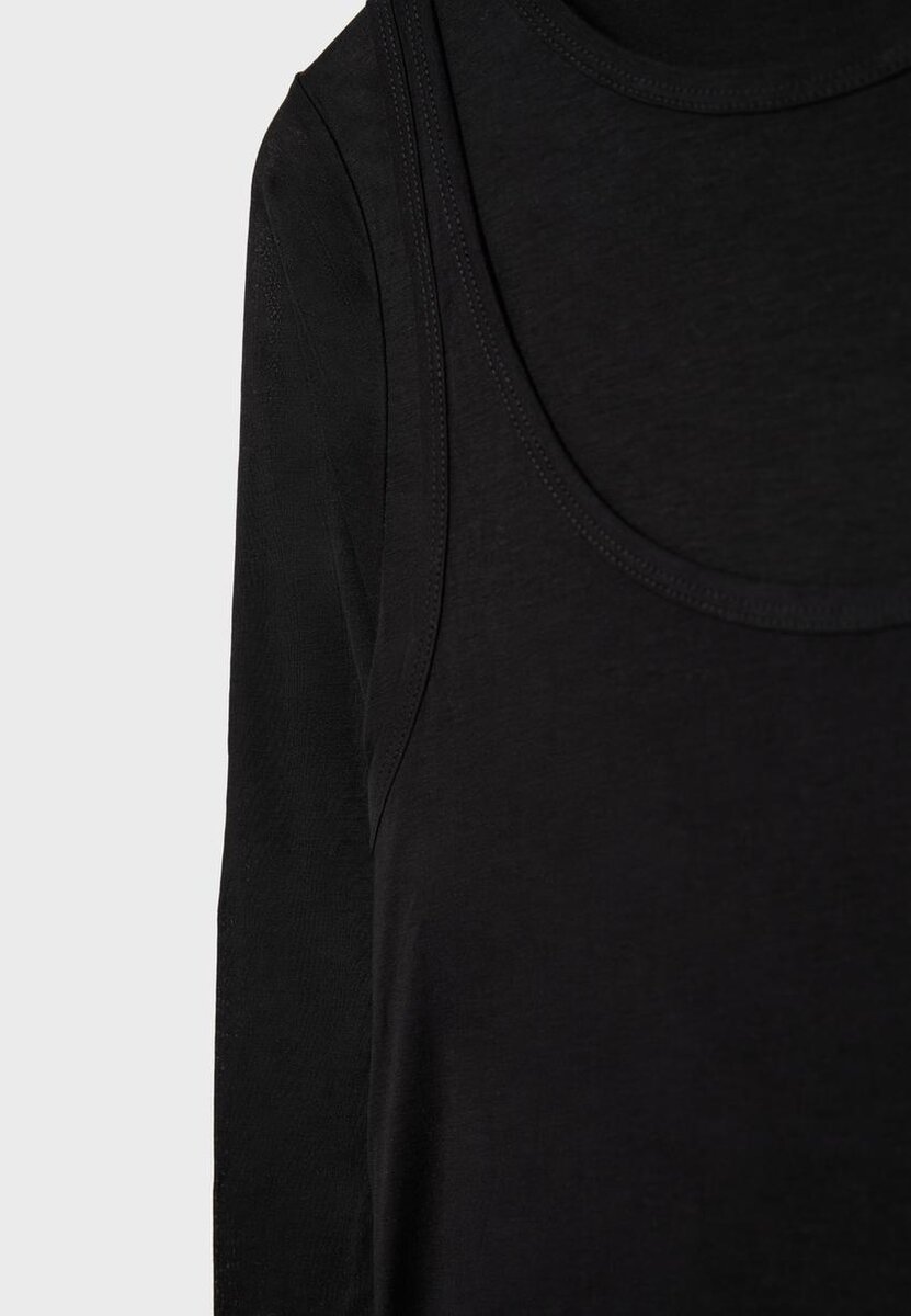 T-shirt à col rond et manches longues. Doté d’une superposition de tissu à effet double épaisseur ton sur ton.