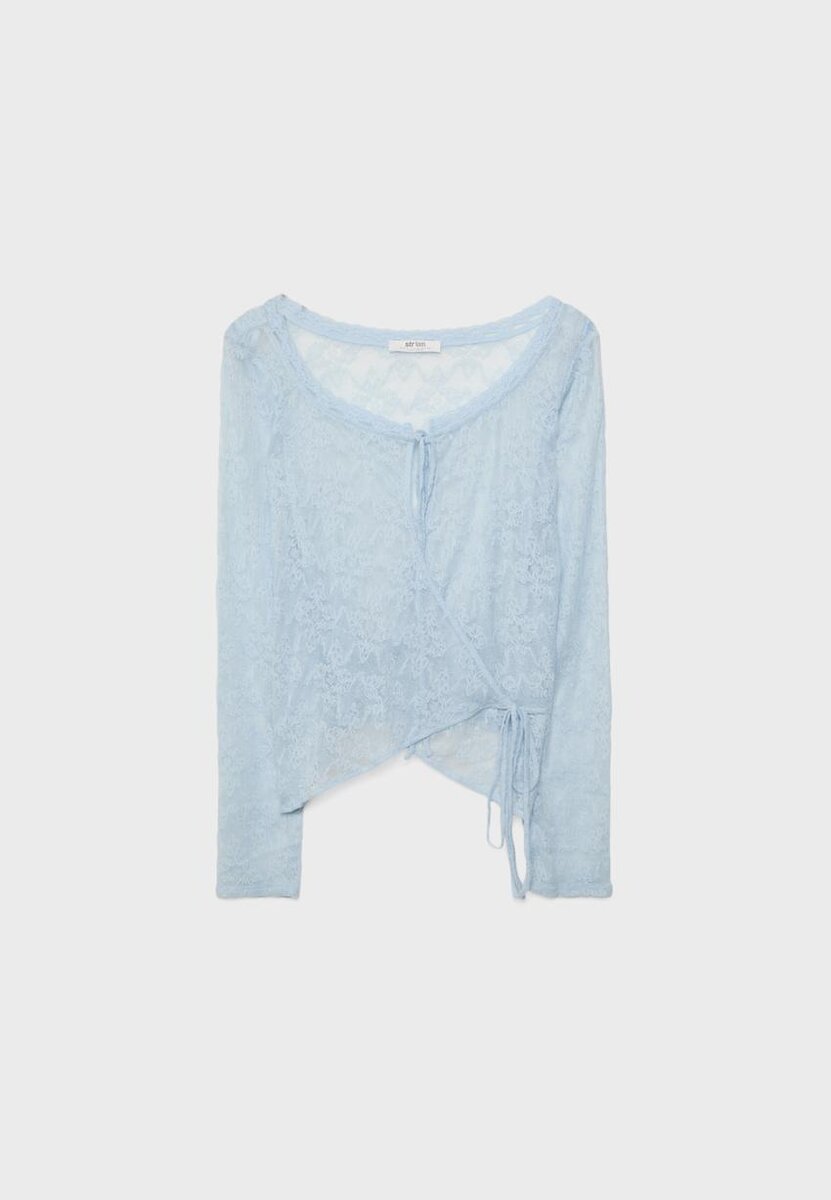 T-shirt à col rond et manches longues en dentelle. Fermeture croisée à l’avant avec un nœud.