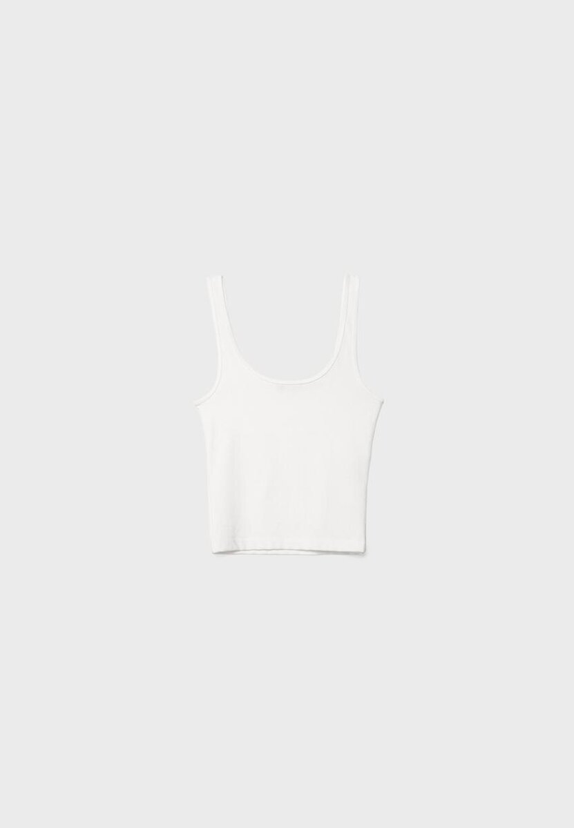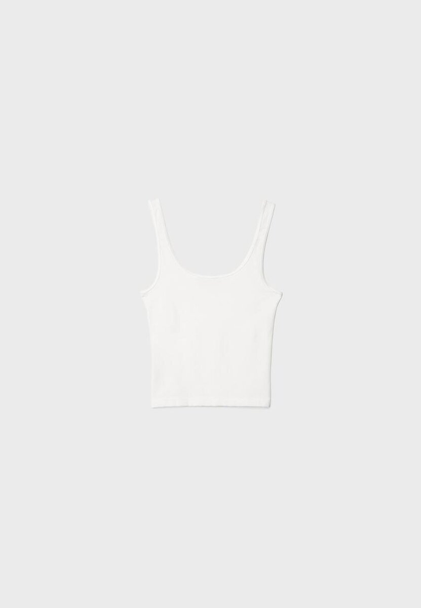 T-shirt court ajusté à col rond et bretelles larges. Disponible en plusieurs couleurs.